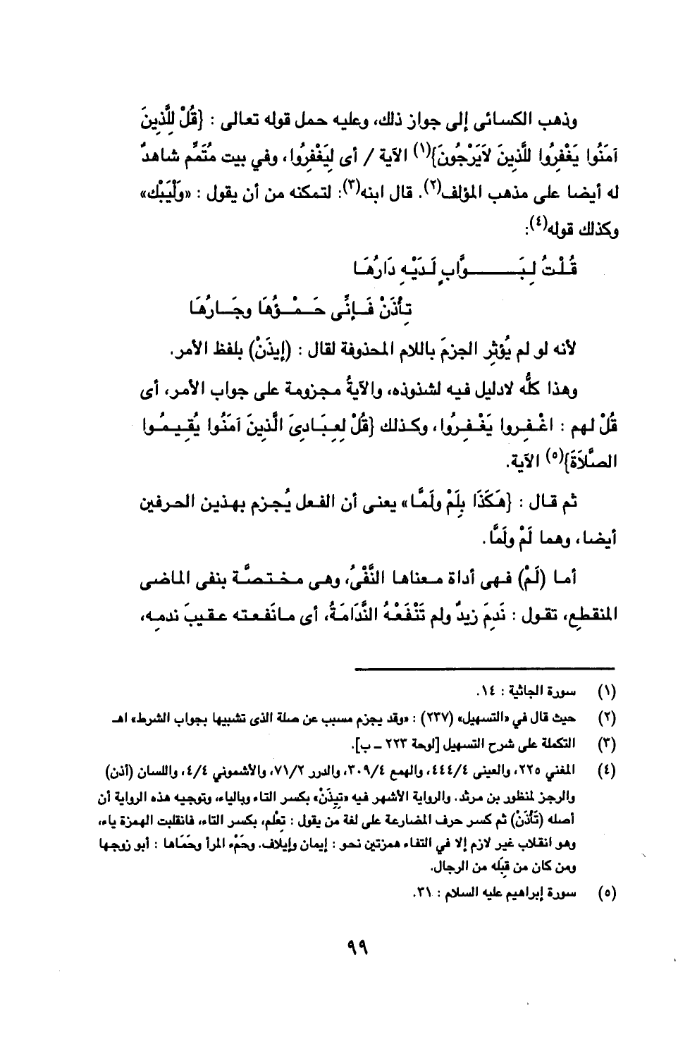 وذهب الكسائي إلى جواز ذلك، وعليه حمل قوله تعالى: } قل للذين آمنوا يغفروا للذين لا يرجون} الآية/أي ليغفروا، وفي بيت متمم شاهد له أيضا على مذهب المؤلف. قال ابنه: لتمكنه من أن يقول: "ولبيك" وكذلك قوله: