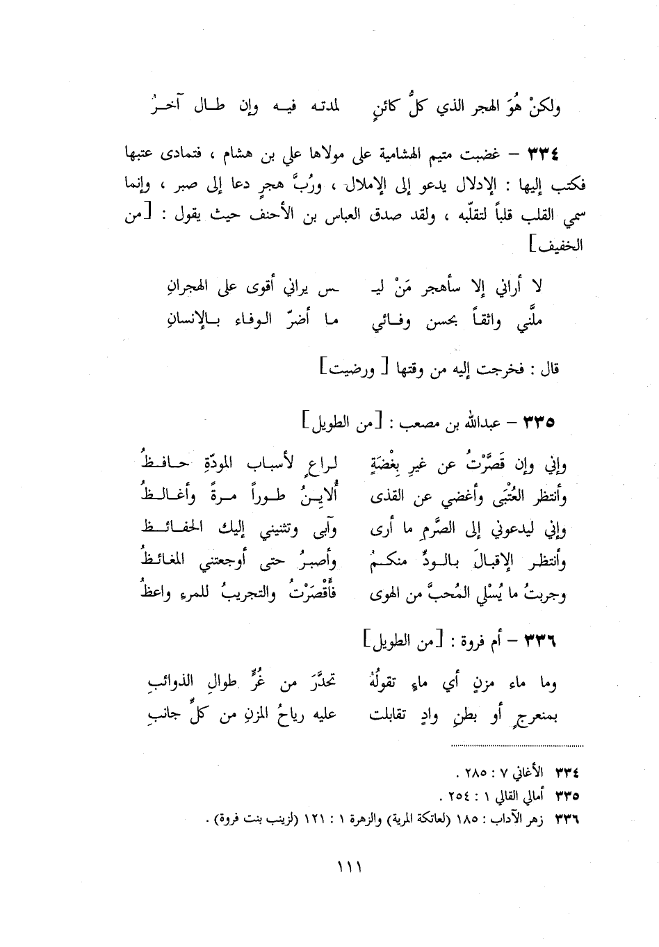 [336] زهر الآداب: 185 (لعاتكة المرية) والزهرة 1: 121 (لزينب بنت فروة) .