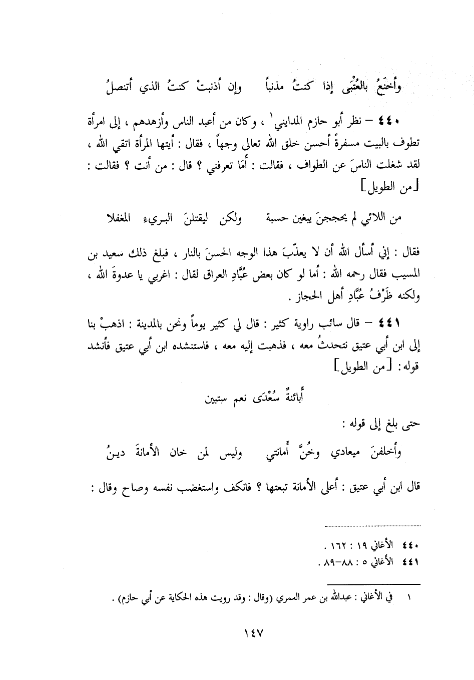 [441]- قال سائب راوية كثير: قال لي كثير يوما ونحن بالمدينة: اذهب بنا إلى ابن أبي عتيق نتحدث معه، فذهبت إليه معه، فاستنشده ابن أبي عتيق فأنشد قوله: [من الطويل]