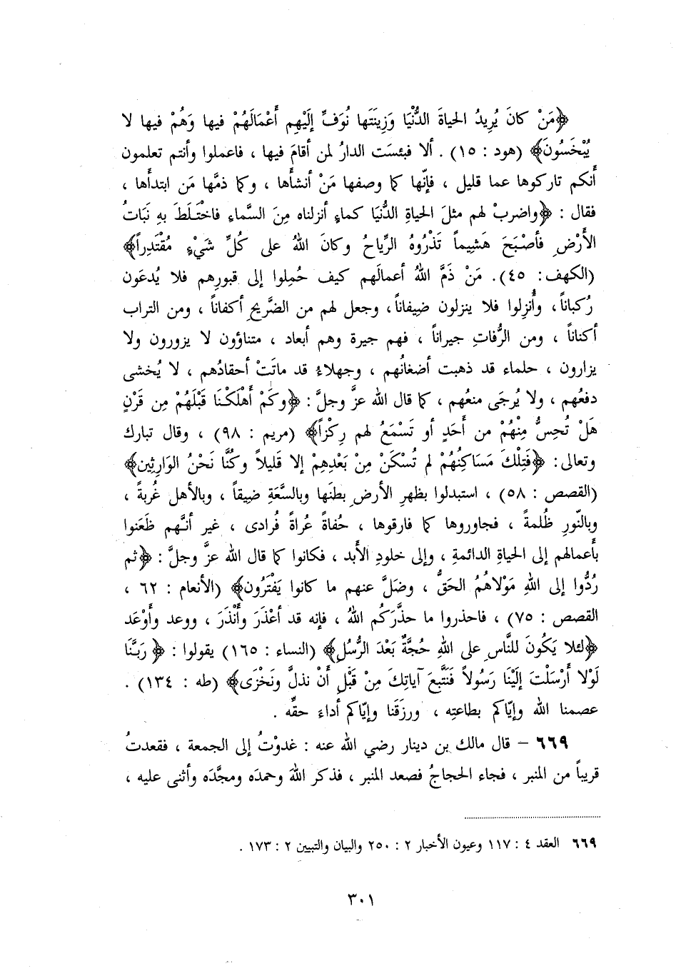 [669]- قال مالك بن دينار رضي الله عنه: غدوت إلى الجمعة، فقعدت قريبا من المنبر، فجاء الحجاج فصعد المنبر، فذكر الله وحمده ومجّده وأثنى عليه،