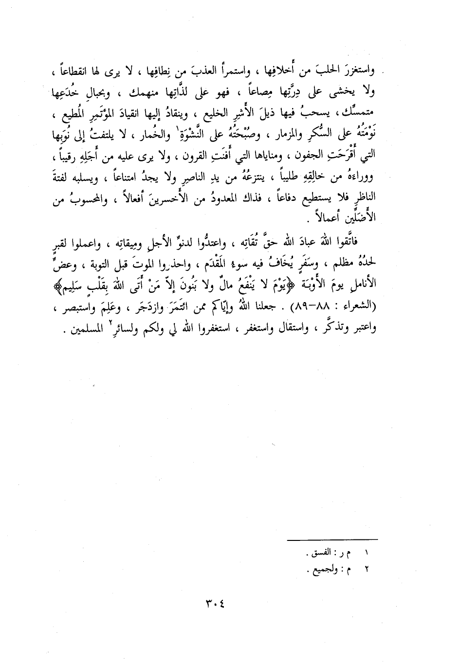 (الشعراء: 88- 89) . جعلنا الله وإيّاكم ممن ائتمر وازدجر، وعلم واستبصر، واعتبر وتذكّر، واستقال واستغفر، استغفروا الله لي ولكم ولسائر «2» المسلمين.
