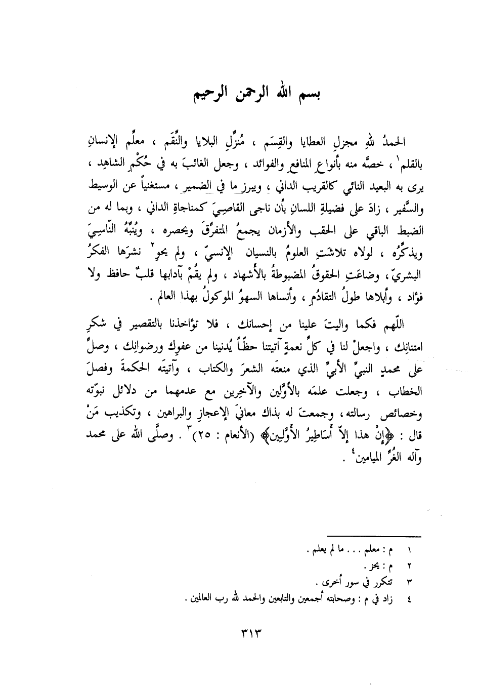اللهم فكما واليت علينا من إحسانك، فلا تؤاخذنا بالتقصير في شكر امتنانك، واجعل لنا في كلّ نعمة آتيتنا حظّا يدنينا من عفوك ورضوانك، وصلّ على محمد النبيّ الأبيّ الذي منعته الشعر والكتاب، وآتيته الحكمة وفصل الخطاب، وجعلت علمه بالأوّلين والآخرين مع عدمهما من دلائل نبوّته وخصائص رسالته، وجمعت له بذاك معاني الإعجاز والبراهين، وتكذيب من قال: إِنْ هذا إِلَّا أَساطِيرُ الْأَوَّلِينَ*