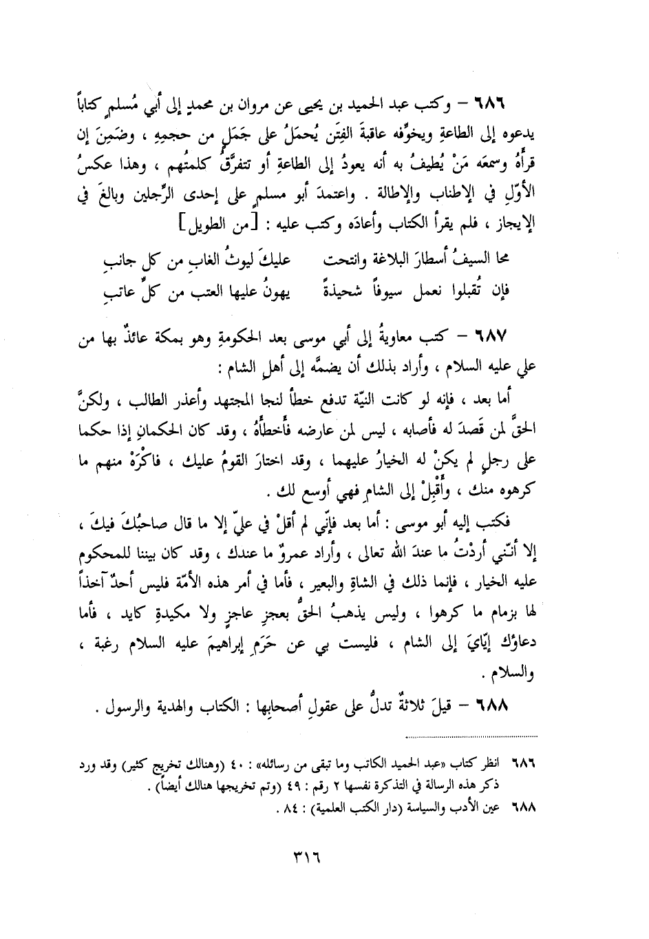 [686]- وكتب عبد الحميد بن يحيى عن مروان بن محمد إلى أبي مسلم كتابا يدعوه إلى الطاعة ويخوّفه عاقبة الفتن يحمل على جمل من حجمه، وضمن إن قرأه وسمعه من يطيف به أنه يعود إلى الطاعة أو تتفرّق كلمتهم، وهذا عكس الأوّل في الإطناب والإطالة. واعتمد أبو مسلم على إحدى الرّجلين وبالغ في الإيجاز، فلم يقرأ الكتاب وأعاده وكتب عليه: [من الطويل]