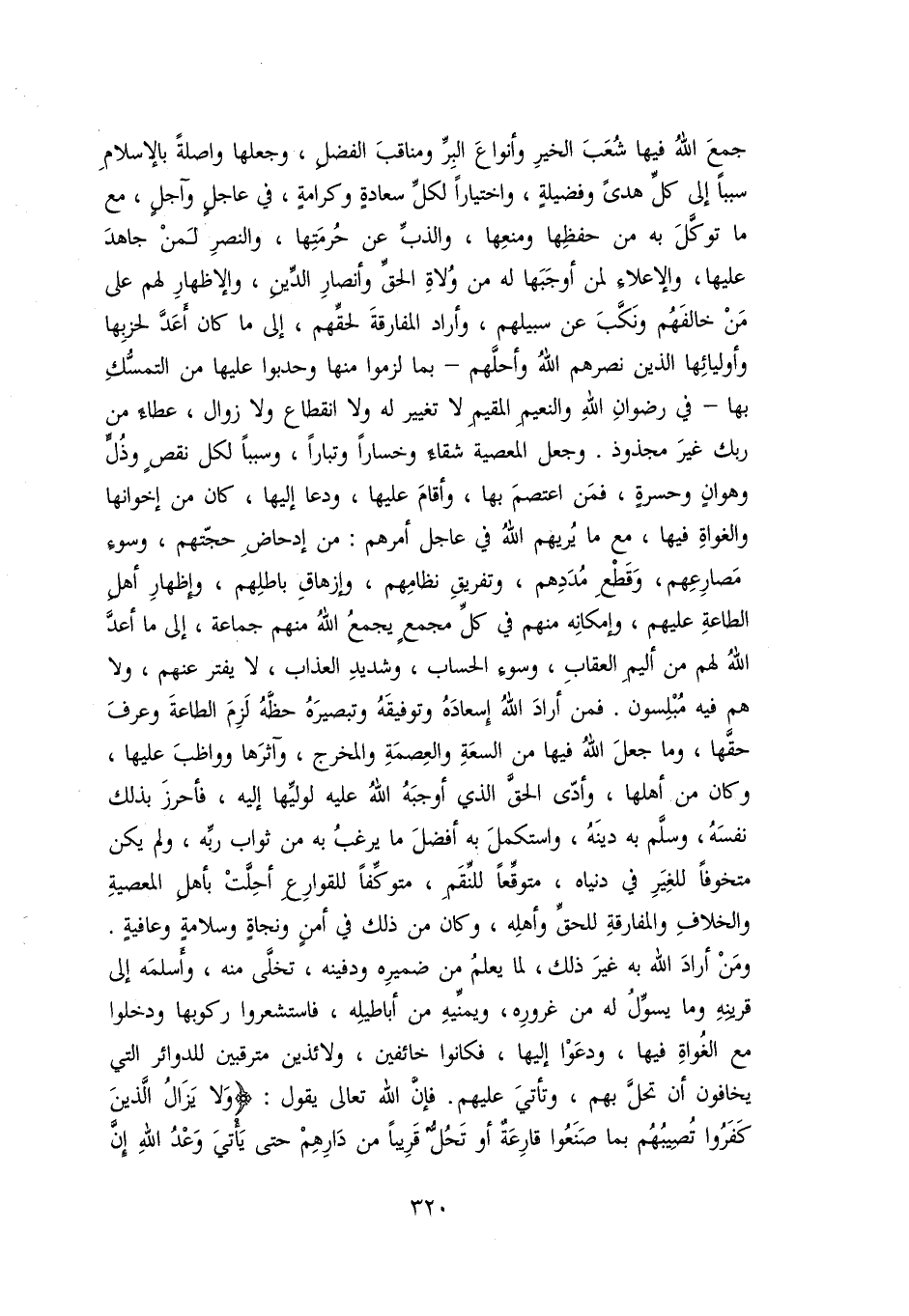 جمع الله فيها شعب الخير وأنواع البرّ ومناقب الفضل، وجعلها واصلة بالإسلام سببا إلى كلّ هدى وفضيلة، واختيارا لكلّ سعادة وكرامة، في عاجل وآجل، مع ما توكّل به من حفظها ومنعها، والذبّ عن حرمتها، والنصر لمن جاهد عليها، والإعلاء لمن أوجبها له من ولاة الحقّ وأنصار الدّين، والإظهار لهم على من خالفهم ونكّب عن سبيلهم، وأراد المفارقة لحقّهم، إلى ما كان أعدّ لحزبها وأوليائها الذين نصرهم الله وأحلّهم- بما لزموا منها وحدبوا عليها من التمسّك بها- في رضوان الله والنعيم المقيم لا تغيير له ولا انقطاع ولا زوال، عطاء من ربك غير مجذوذ. وجعل المعصية شقاء وخسارا وتبارا، وسببا لكل نقص وذلّ وهوان وحسرة، فمن اعتصم بها، وأقام عليها، ودعا إليها، كان من إخوانها والغواة فيها، مع ما يريهم الله في عاجل أمرهم: من إدحاض حجّتهم، وسوء مصارعهم، وقطع مددهم، وتفريق نظامهم، وإزهاق باطلهم، وإظهار أهل الطاعة عليهم، وإمكانه منهم في كلّ مجمع يجمع الله منهم جماعة، إلى ما أعدّ الله لهم من أليم العقاب، وسوء الحساب، وشديد العذاب، لا يفتر عنهم، ولا هم فيه مبلسون. فمن أراد الله إسعاده وتوفيقه وتبصيره حظّه لزم الطاعة وعرف حقّها، وما جعل الله فيها من السعة والعصمة والمخرج، وآثرها وواظب عليها، وكان من أهلها، وأدّى الحقّ الذي أوجبه الله عليه لوليّها إليه، فأحرز بذلك نفسه، وسلّم به دينه، واستكمل به أفضل ما يرغب به من ثواب ربّه، ولم يكن متخوفا للغير في دنياه، متوقّعا للنّقم، متوكّفا للقوارع أحلّت بأهل المعصية والخلاف والمفارقة للحقّ وأهله، وكان من ذلك في أمن ونجاة وسلامة وعافية.