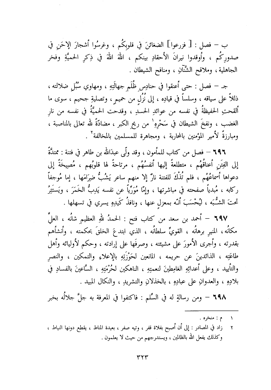 697- أحمد بن سعد من كتاب فتح: الحمد لله العظيم شانه، العليّ مكانه، المنير برهانه، القويّ سلطانه، الذي ابتدع الخلق بحكمته، وأنشأهم بقدرته، وأجرى الأمور على مشيئته، وصرفها على إرادته، وحكم لأوليائه وأهل طاعته، الذائدين عن حريمه، المانعين لحوزته بالإعلاء والتمكين، والنصر والتأييد، وعلى أعدائه الغامطين لنعمته، الناهكين لحرمته، السّاعين بالفساد في بلاده، والعدوان على عباده، بالخذلان والتشريد، والنكال المبيد.