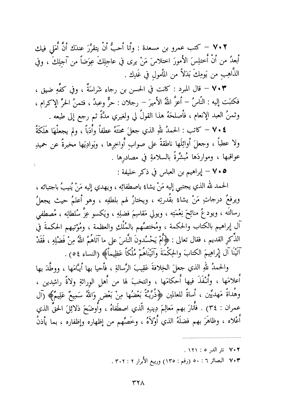 والحمد لله الذي جعل الخلافة عقيب الرّسالة، فأحيا بها أيّامها، ووطّد بها أعلامها، وأنفذ فيها أحكامها، وانتخب لها من أهل الوراثة ولاة راشدين، وهداة مهديّين، أساة للعالمين ذُرِّيَّةً بَعْضُها مِنْ بَعْضٍ وَاللَّهُ سَمِيعٌ عَلِيمٌ