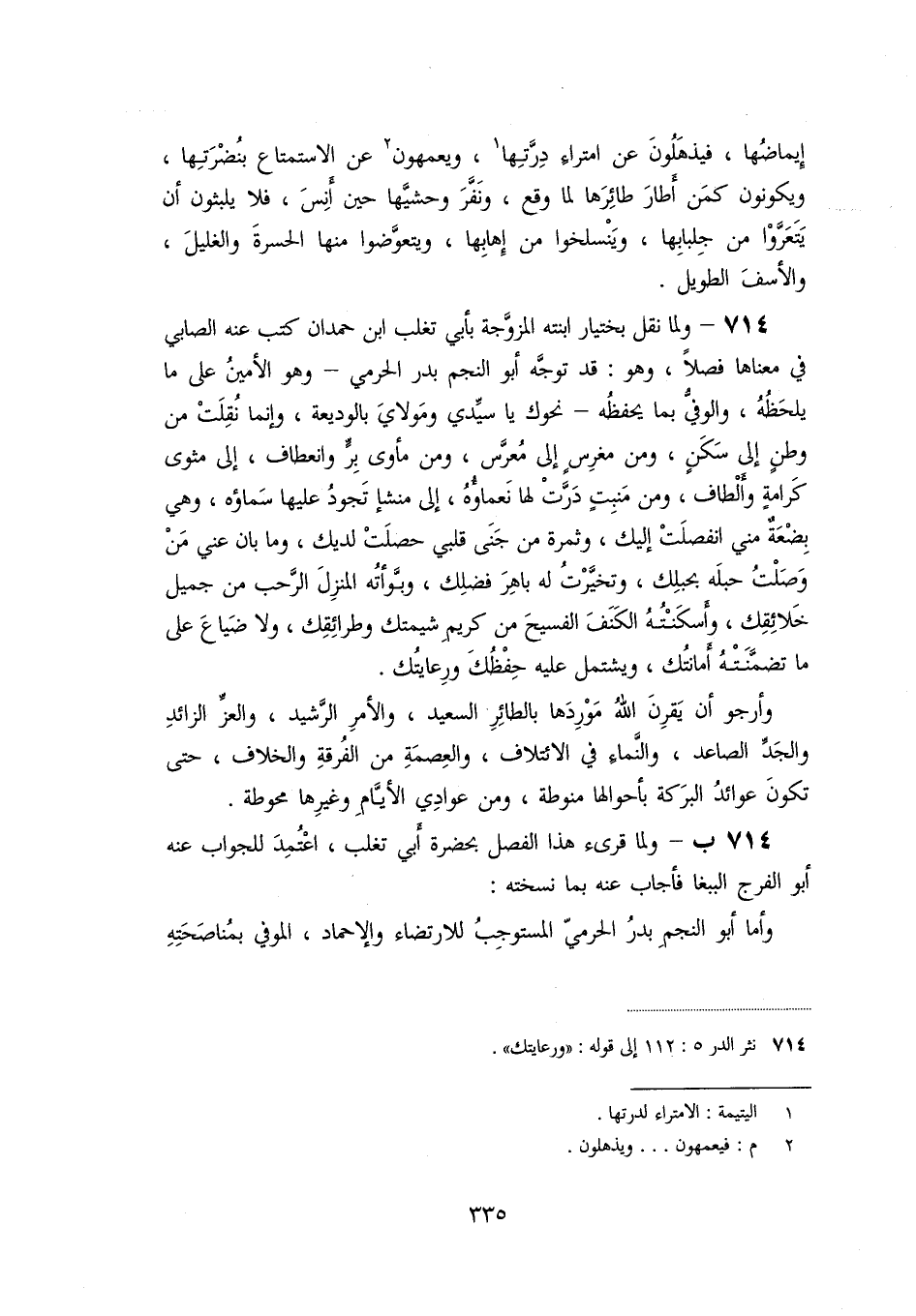 [714]- ب- ولما قرىء هذا الفصل بحضرة أبي تغلب، اعتمد للجواب عنه أبو الفرج الببغا فأجاب عنه بما نسخته: