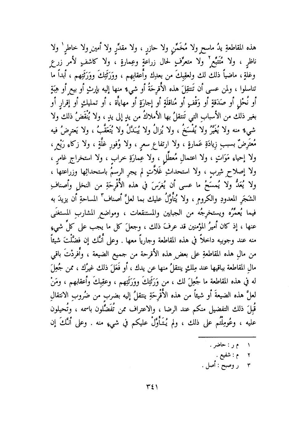 هذه المقاطعة يد ماسح ولا مخمّن ولا حازر، ولا مقدّر ولا أمين ولا خاطر «1» ولا ناظر، ولا متتّبع «2» ولا متعرّف لحال زراعة وعمارة، ولا كاشف لأمر زرع وغلة، ماضيا ذلك لك ولعقبك من بعدك وأعقابهم، وورثتك وورثتهم، أبدا ما تناسلوا، ولمن عسى أن تنتقل هذه الأقرحة أو شيء منها إليه بإرث أو بيع أو هبة أو نحل أو صدقة أو وقف أو مناقلة أو إجارة أو مهايأة، أو تمليك أو إقرار أو بغير ذلك من الأسباب التي تنتقل بها الأملاك من يد إلى يد، ولا ينقض ذلك ولا شيء منه ولا يغيّر ولا يفسخ، ولا يزال ولا يبدّل ولا يتعقّب، ولا يعترض فيه معترض بسبب زيادة عمارة، ولا ارتفاع سعر، ولا وفور غلّة، ولا زكاء ريع، ولا إحياء موات، ولا اعتمال معطّل، ولا عمارة خراب، ولا استخراج غامر، ولا إصلاح شرب، ولا استحداث غلّات لم يجر الرسم باستحداثها وزراعتها، ولا يعدّ ولا يمسح ما عسى أن يغرس في هذه الأقرحة من النخل وأصناف الشجر المعدود والكروم، ولا يتأوّل عليك بما لعلّ أصناف «3» المساحة أن يزيد به فيما يعمّره ويستخرجه من الجبابين والمستنقعات، ومواضع المشارب المستغنى عنها، إذ كان أمير المؤمنين قد عرف ذلك، وجعل كل ما يجب على كلّ شيء منه عند وجوبه داخلا في هذه المقاطعة وجاريا معها. وعلى أنّك إن فضّلت شيئا من مال هذه المقاطعة على بعض هذه الأقرحة من جميع الضيعة، وأفردت باقي مال المقاطعة بباقيها عند ملك ينتقل منها عن يدك، أو فعل ذلك غيرك، ممن جعل له في هذه المقاطعة ما جعل لك، من ورثتك وورثتهم، وعقبك وأعقابهم، ومن لعلّ هذه الضيعة أو شيئا من هذه الأقرحة ينتقل إليه بضرب من ضروب الانتقال قبل ذلك التفضيل منكم عند الرضا، والاعتراف ممن تفضّلون باسمه، وتحيلون عليه، وعوملتم على ذلك، ولم يتأوّل عليكم في شيء منه. وعلى أنّك إن