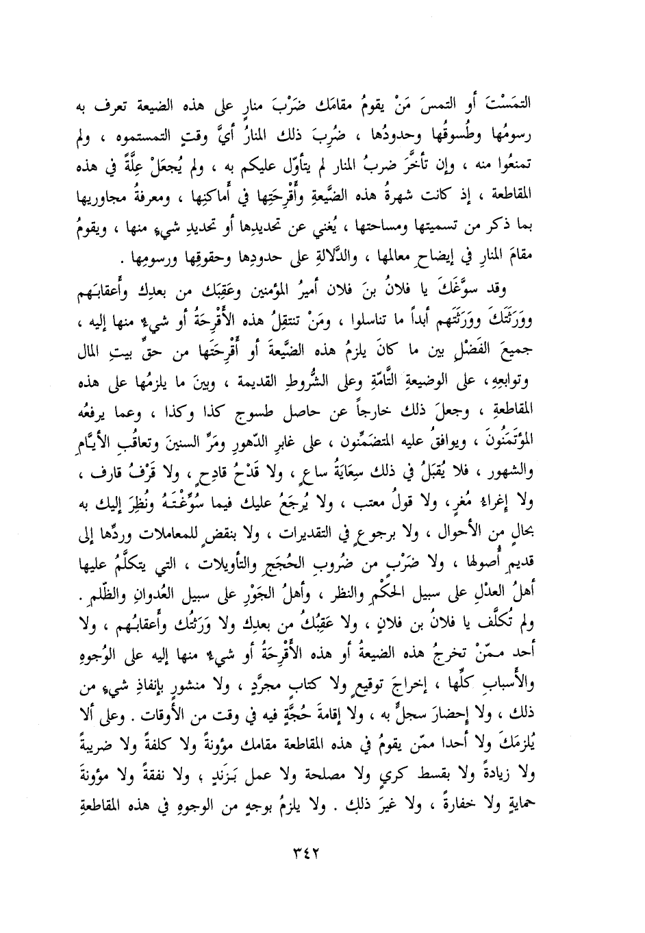 التمست أو التمس من يقوم مقامك ضرب منار على هذه الضيعة تعرف به رسومها وطسوقها وحدودها، ضرب ذلك المنار أيّ وقت التمستموه، ولم تمنعوا منه، وإن تأخّر ضرب المنار لم يتأوّل عليكم به، ولم يجعل علّة في هذه المقاطعة، إذ كانت شهرة هذه الضّيعة وأقرحتها في أماكنها، ومعرفة مجاوريها بما ذكر من تسميتها ومساحتها، يغني عن تحديدها أو تحديد شيء منها، ويقوم مقام المنار في إيضاح معالمها، والدّلالة على حدودها وحقوقها ورسومها.