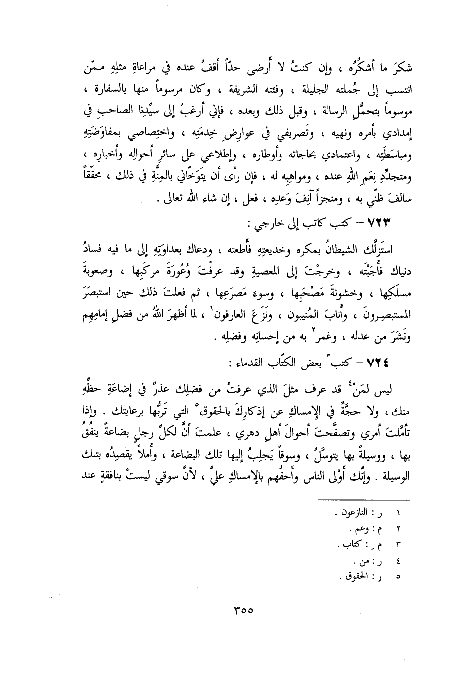 شكر ما أشكره، وإن كنت لا أرضى حدّا أقف عنده في مراعاة مثله ممّن انتسب إلى جملته الجليلة، وفئته الشريفة، وكان مرسوما منها بالسفارة، موسوما بتحمّل الرسالة، وقبل ذلك وبعده، فإني أرغب إلى سيّدنا الصاحب في إمدادي بأمره ونهيه، وتصريفي في عوارض خدمته، واختصاصي بمفاوضته ومباسطته، واعتمادي بحاجاته وأوطاره، وإطلاعي على سائر أحواله وأخباره، ومتجدّد نعم الله عنده، ومواهبه له، فإن رأى أن يتوخّاني بالمنّة في ذلك، محقّقا سالف ظنّي به، ومنجزا آنف وعده، فعل، إن شاء الله تعالى.