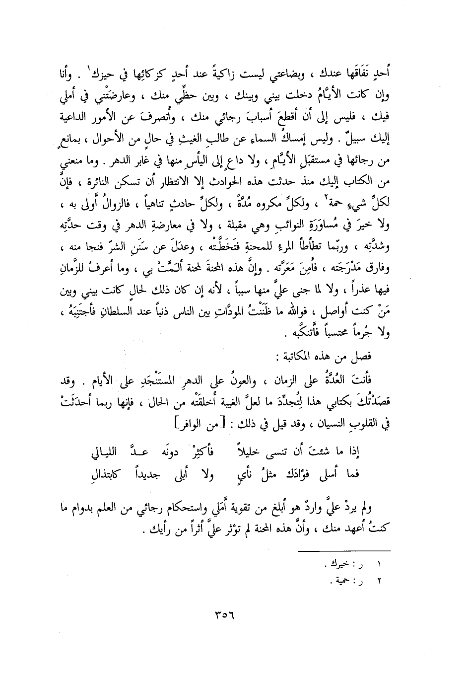 أحد نفاقها عندك، وبضاعتي ليست زاكية عند أحد كزكائها في حيزك «1» . وأنا وإن كانت الأيّام دخلت بيني وبينك، وبين حظّي منك، وعارضتني في أملي فيك، فليس إلى أن أقطع أسباب رجائي منك، وأنصرف عن الأمور الداعية إليك سبيل. وليس إمساك السماء عن طالب الغيث في حال من الأحوال، بمانع من رجائها في مستقبل الأيّام، ولا داع إلى اليأس منها في غابر الدهر. وما منعني من الكتاب إليك منذ حدثت هذه الحوادث إلا الانتظار أن تسكن النائرة، فإنّ لكلّ شيء حمة «2» ، ولكلّ مكروه مدّة، ولكلّ حادث تناهيا، فالزوال أولى به، ولا خير في مساورة النوائب وهي مقبلة، ولا في معارضة الدهر في وقت حدّته وشدّته، وربّما تطأطأ المرء للمحنة فتخطّته، وعدل عن سنن الشرّ فنجا منه، وفارق مدرجته، فأمن معرّته. وإنّ هذه المحنة لمحنة ألمّت بي، وما أعرف للزّمان فيها عذرا، ولا لما جنى عليّ منها سببا، لأنه إن كان ذلك لحال كانت بيني وبين من كنت أواصل، فو الله ما ظننت المودّات بين الناس ذنبا عند السلطان فأجتنبه، ولا جرما محتسبا فأتنكّبه.