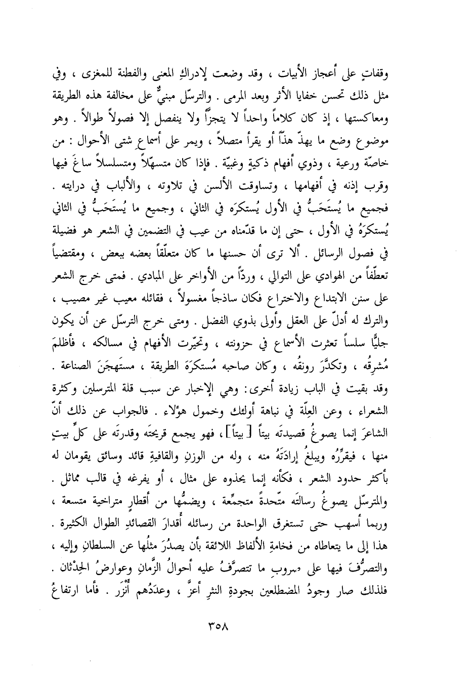 وقفات على أعجاز الأبيات، وقد وضعت لإدراك المعنى والفطنة للمغزى، وفي مثل ذلك تحسن خفايا الأثر وبعد المرمى. والترسّل مبنيّ على مخالفة هذه الطريقة ومعاكستها، إذ كان كلاما واحدا لا يتجزّأ ولا ينفصل إلا فصولا طوالا. وهو موضوع وضع ما يهذّ هذّا أو يقرأ متصلا، ويمر على أسماع شتى الأحوال: من خاصّة ورعية، وذوي أفهام ذكية وغبيّة. فإذا كان متسهّلا ومتسلسلا ساغ فيها وقرب إذنه في أفهامها، وتساوقت الألسن في تلاوته، والألباب في درايته.