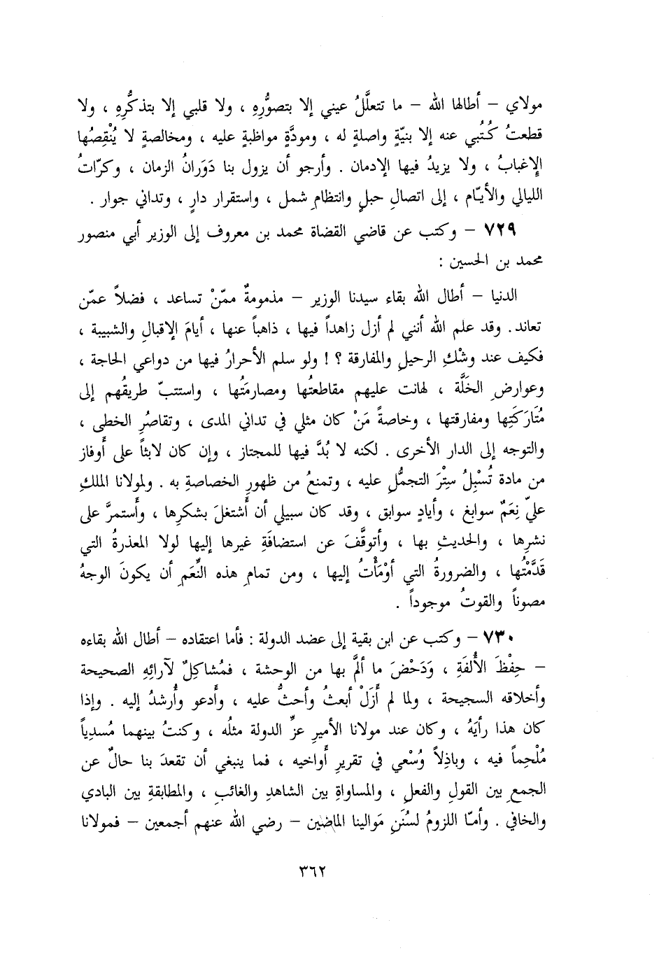 مولاي- أطالها الله- ما تتعلّل عيني إلا بتصوّره، ولا قلبي إلا بتذكّره، ولا قطعت كتبي عنه إلا بنيّة واصلة له، ومودّة مواظبة عليه، ومخالصة لا ينقصها الإغباب، ولا يزيد فيها الإدمان. وأرجو أن يزول بنا دوران الزمان، وكرّات الليالي والأيّام، إلى اتصال حبل وانتظام شمل، واستقرار دار، وتداني جوار.