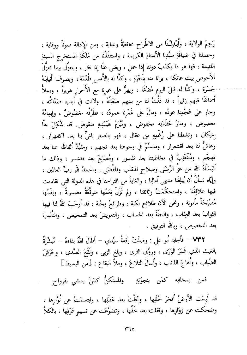 732- فأجابه أبو علي: وصلت رقعة سيّدي- أطال الله بقاءه- مبشّرة بالغيث الذي غمر الورى، وروّى الثرى، وبلغ الزبى، ونقع الصّدى، وحرش الضّباب، وأهاج الذئاب، وأسال التلاع، وملأ البقاع: [من البسيط]