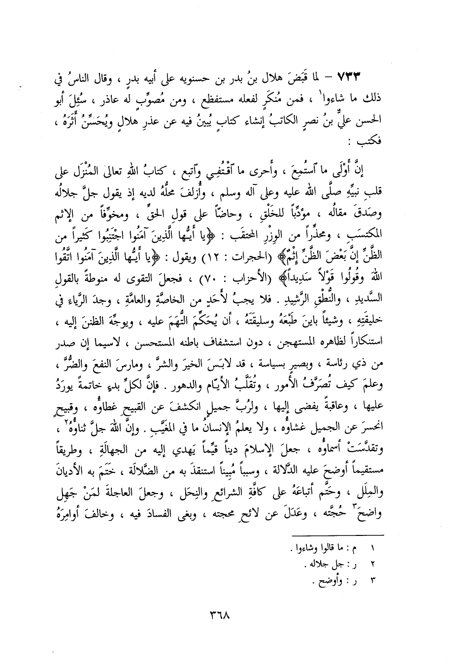 733- لما قبض هلال بن بدر بن حسنويه على أبيه بدر، وقال الناس في ذلك ما شاءوا «1» ، فمن منكر لفعله مستفظع، ومن مصوّب له عاذر، سئل أبو الحسن عليّ بن نصر الكاتب إنشاء كتاب يبين فيه عن عذر هلال ويحسّن أثره، فكتب: