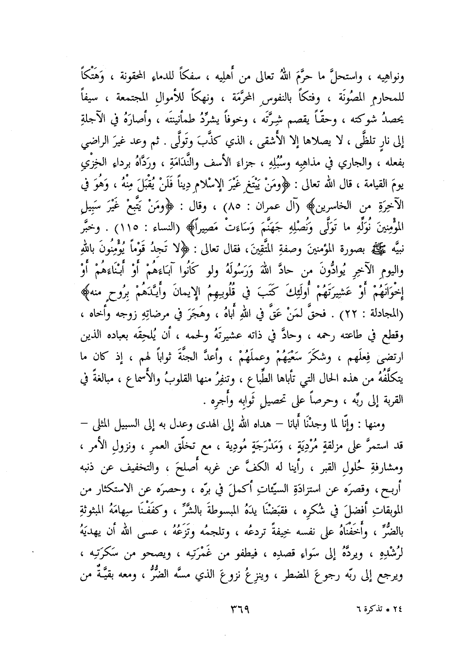 (المجادلة: 22) . فحقّ لمن عقّ في الله أباه، وهجر في مرضاته زوجه وأخاه، وقطع في طاعته رحمه، وحادّ في ذاته عشيرته ولحمه، أن يلحقه بعباده الذين ارتضى فعلهم، وشكر سعيهم وعملهم، وأعدّ الجنّة ثوابا لهم، إذ كان ما يتكلّفه من هذه الحال التي تأباها الطّباع، وتنفر منها القلوب والأسماع، مبالغة في القربة إلى ربّه، وحرصا على تحصيل ثوابه وأجره.