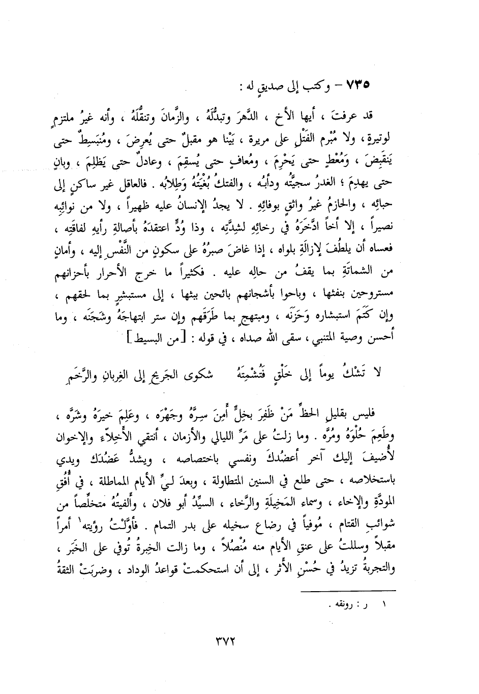 قد عرفت، أيها الأخ، الدّهر وتبدّله، والزّمان وتنقّله، وأنه غير ملتزم لوتيرة، ولا مبرم الفتل على مريرة، بينا هو مقبل حتى يعرض، ومنبسط حتى ينقبض، ومعط حتى يحرم، ومعاف حتى يسقم، وعادل حتى يظلم، وبان حتى يهدم؛ الغدر سجيّته ودأبه، والفتك بغيته وطلابه. فالعاقل غير ساكن إلى حبائه، والحازم غير واثق بوفائه. لا يجد الإنسان عليه ظهيرا، ولا من نوائبه نصيرا، إلا أخا ادّخره في رخائه لشدّته، وذا ودّ اعتقده بأصالة رأيه لفاقته، فعساه أن يلطف لإزالة بلواه، إذا غاض صبره على سكون من النّفس إليه، وأمان من الشماتة بما يقف من حاله عليه. فكثيرا ما خرج الأحرار بأحزانهم مستروحين بنفثها، وباحوا بأشجانهم بائحين ببثها، إلى مستبشر بما لحقهم، وإن كتم استبشاره وحزنه، ومبتهج بما طرقهم وإن ستر ابتهاجه وشجنه، وما أحسن وصية المتنبي، سقى الله صداه، في قوله: [من البسيط]