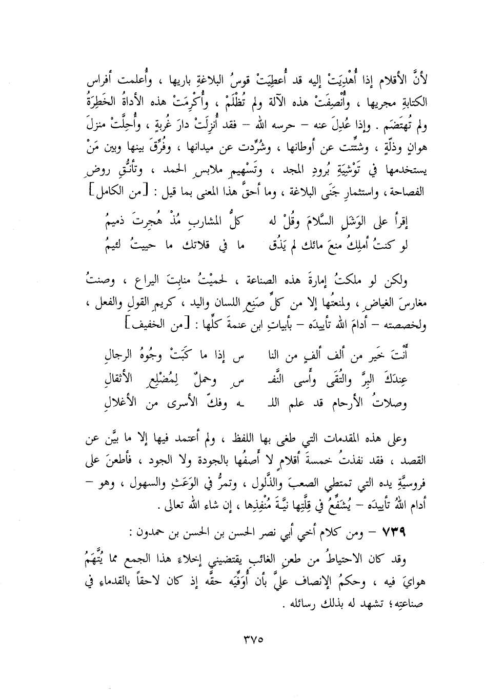 739- ومن كلام أخي أبي نصر الحسن بن الحسن بن حمدون: