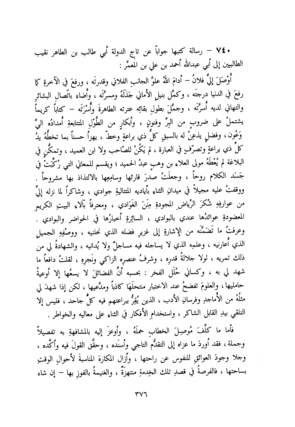740- رسالة كتبها جوابا عن تاج الدولة أبي طالب بن الطاهر نقيب الطالبيين إلى أبي عبد الله أحمد بن علي بن المعمّر: