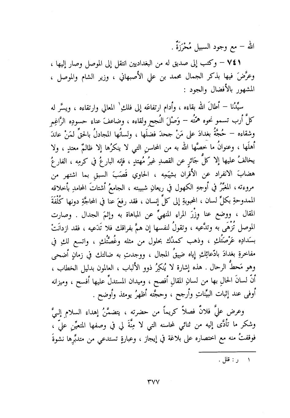 سيّدنا- أطال الله بقاءه، وأدام ارتفاعه إلى فلك «1» المعالي وارتقاءه، ويسّر له كلّ أرب تسمو نحوه همّته- وصل النجح ولقاءه، وضاعف عناء حسوده الرّاغم وشقاءه- حجّة بغداد على من جحد فضلها، ولسانها المجادل بالحقّ لمن عاند أهلها، وعنوان ما خصّها الله به من المحاسن التي لا ينكرها إلا ظالم معتد، ولا يخالف عليها إلا كلّ جائر عن القصد غير مهتد، فإنه البارع في كرمه، الفارع هضاب الانفراد عن الأقران بشيمه، الحاوي قصب السبق بما اشتهر من مروءته، المغبّر في أوجه الكهول في ريعان شبيبته، الجامع أشتات المحامد بأخلاقه الممدوحة بكلّ لسان، المحبوبة إلى كلّ إنسان، فقد رفع عنا في المحاجّة دونها كلفة المقال، ووضع عنا وزر المراء المنهيّ عن المباهاة به وإثم الجدال. وصارت الموصل تزهى به وتدّعيه، وتقول لنفسها إن همّ بفراقك فلا تدعيه، فقد ازدانت بسداده عرصتك، وذهب كمدك بحلول من مثله وغصّتك، واتسع لك في مفاخرة بغداد بادّعائك إياه ضيق المجال، ووجدت به ضالتك في زمان أضحى وهو محطّ الرحال. هذه إشارة لا ينكر ذوو الألباب، العالمون بدليل الخطاب، أنّ لسان الحال بها من لسان المقال أفصح، وميدان المستدلّ عليها أفسح، وميزانه أوفى عند إثبات البيّنات وأرجح، وحجّته أظهر يومئذ وأوضح.