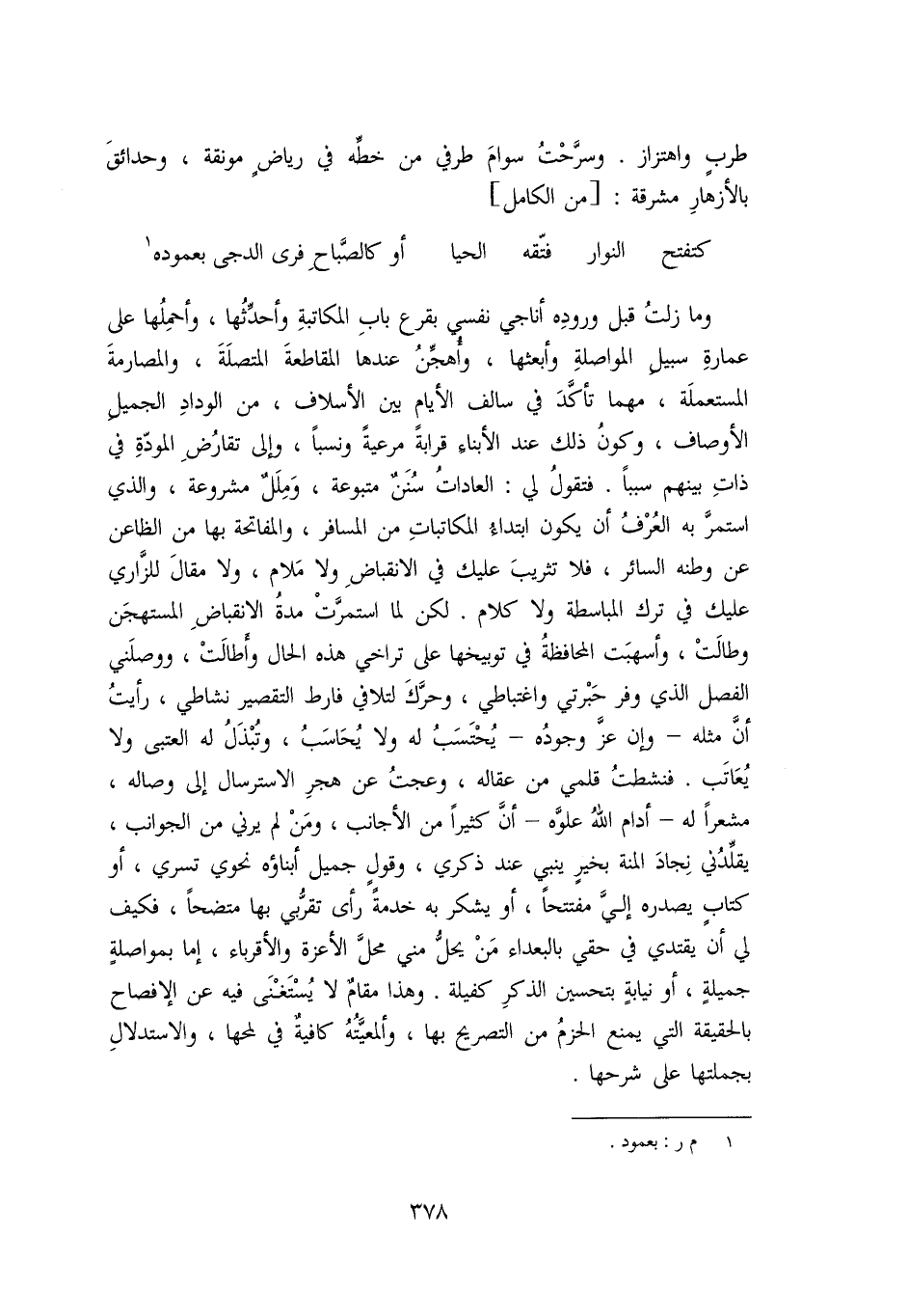 وما زلت قبل وروده أناجي نفسي بقرع باب المكاتبة وأحدّثها، وأحملها على عمارة سبيل المواصلة وأبعثها، وأهجّن عندها المقاطعة المتصلة، والمصارمة المستعملة، مهما تأكّد في سالف الأيام بين الأسلاف، من الوداد الجميل الأوصاف، وكون ذلك عند الأبناء قرابة مرعية ونسبا، وإلى تقارض المودّة في ذات بينهم سببا. فتقول لي: العادات سنن متبوعة، وملل مشروعة، والذي استمرّ به العرف أن يكون ابتداء المكاتبات من المسافر، والمفاتحة بها من الظاعن عن وطنه السائر، فلا تثريب عليك في الانقباض ولا ملام، ولا مقال للزّاري عليك في ترك المباسطة ولا كلام. لكن لما استمرّت مدة الانقباض المستهجن وطالت، وأسهبت المحافظة في توبيخها على تراخي هذه الحال وأطالت، ووصلني الفصل الذي وفر حبرتي واغتباطي، وحرّك لتلافي فارط التقصير نشاطي، رأيت أنّ مثله- وإن عزّ وجوده- يحتسب له ولا يحاسب، وتبذل له العتبى ولا يعاتب. فنشطت قلمي من عقاله، وعجت عن هجر الاسترسال إلى وصاله، مشعرا له- أدام الله علوّه- أنّ كثيرا من الأجانب، ومن لم يرني من الجوانب، يقلّدني نجاد المنة بخير ينبي عند ذكري، وقول جميل أبناؤه نحوي تسري، أو كتاب يصدره إليّ مفتتحا، أو يشكر به خدمة رأى تقرّبي بها متضحا، فكيف لي أن يقتدي في حقي بالبعداء من يحلّ مني محلّ الأعزة والأقرباء، إما بمواصلة جميلة، أو نيابة بتحسين الذكر كفيلة. وهذا مقام لا يستغنى فيه عن الإفصاح بالحقيقة التي يمنع الحزم من التصريح بها، وألمعيّته كافية في لمحها، والاستدلال بجملتها على شرحها.