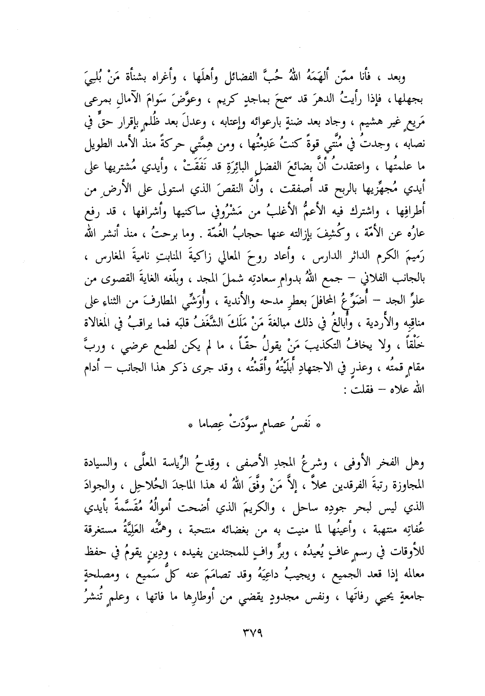 وهل الفخر الأوفى، وشرع المجد الأصفى، وقدح الرّياسة المعلّى، والسيادة المجاوزة رتبة الفرقدين محلّا، إلّا من وفّق الله له هذا الماجد الحلاحل، والجواد الذي ليس لبحر جوده ساحل، والكريم الذي أضحت أمواله مقسّمة بأيدي عفاته منتهبة، وأعينها لما منيت به من بغضائه منتحبة، وهمّته العليّة مستغرقة للأوقات في رسم عاف يعيده، وبرّ واف للمجتدين يفيده، ودين يقوم في حفظ معالمه إذا قعد الجميع، ويجيب داعيه وقد تصامم عنه كلّ سميع، ومصلحة جامعة يحيي رفاتها، ونفس مجدود يقضي من أوطارها ما فاتها، وعلم تنشر