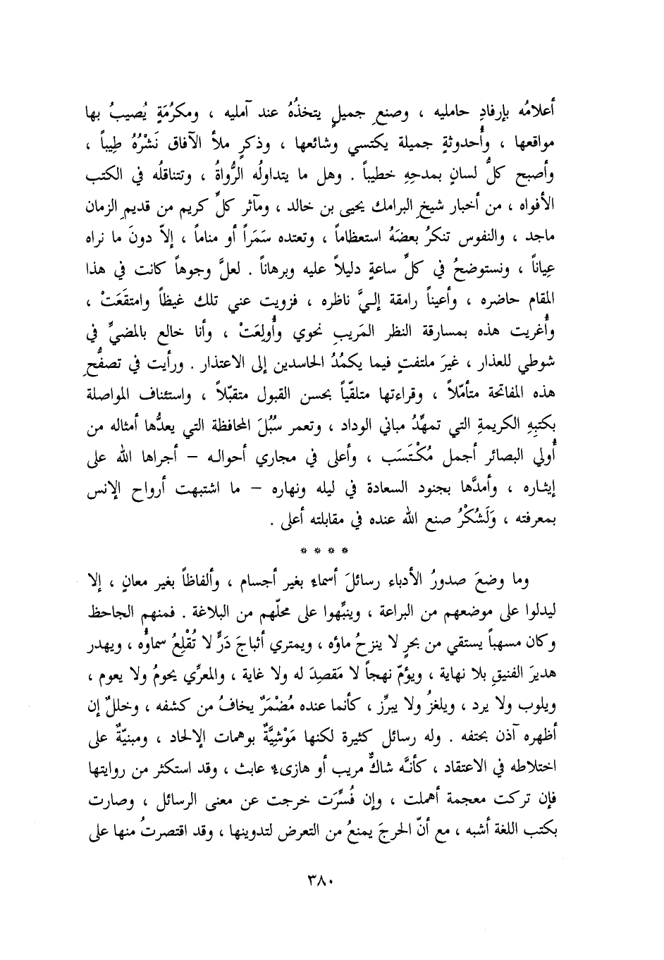**** وما وضع صدور الأدباء رسائل أسماء بغير أجسام، وألفاظا بغير معان، إلا ليدلوا على موضعهم من البراعة، وينبّهوا على محلّهم من البلاغة. فمنهم الجاحظ وكان مسهبا يستقي من بحر لا ينزح ماؤه، ويمتري أثباج درّ لا تقلع سماؤه، ويهدر هدير الفنيق بلا نهاية، ويؤمّ نهجا لا مقصد له ولا غاية، والمعرّي يحوم ولا يعوم، ويلوب ولا يرد، ويلغز ولا يبرّز، كأنما عنده مضمر يخاف من كشفه، وخلل إن أظهره آذن بحتفه. وله رسائل كثيرة لكنها موشيّة بوهمات الإلحاد، ومبنيّة على اختلاطه في الاعتقاد، كأنّه شاكّ مريب أو هازىء عابث، وقد استكثر من روايتها فإن تركت معجمة أهملت، وإن فسّرت خرجت عن معنى الرسائل، وصارت بكتب اللغة أشبه، مع أنّ الحرج يمنع من التعرض لتدوينها، وقد اقتصرت منها على