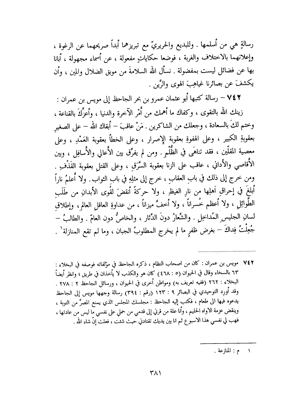 [742]- رسالة كتبها أبو عثمان عمرو بن بحر الجاحظ إلى مويس بن عمران: