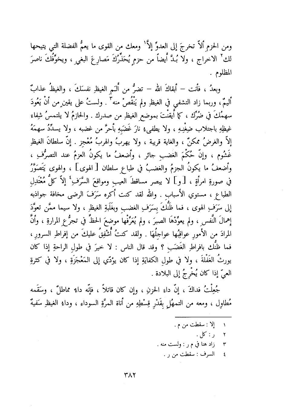 جعلت فداك، إنّ داء الحزن، وإن كان قاتلا، فإنّه داء مماطل، وسقمه مطاول، ومعه من التمهل بقدر قسطه من أناة المرّة السوداء، وداء الغيظ سفيه