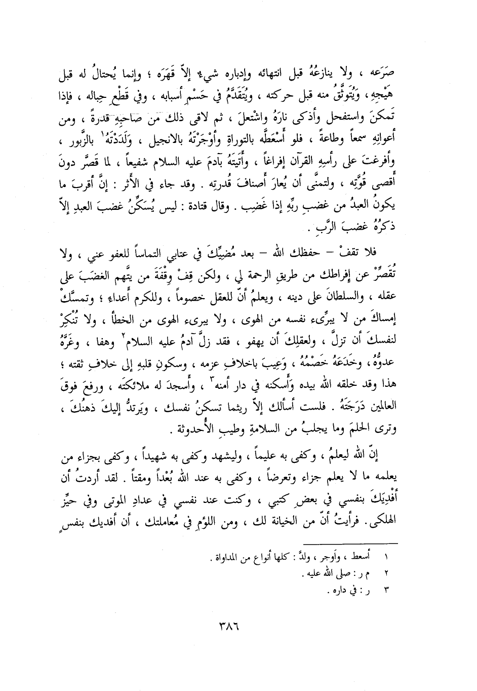 فلا تقف- حفظك الله- بعد مضيّك في عتابي التماسا للعفو عني، ولا تقصّر عن إفراطك من طريق الرحمة لي، ولكن قف وقفة من يتّهم الغضب على عقله، والسلطان على دينه، ويعلم أنّ للعقل خصوما، وللكرم أعداء؛ وتمسّك إمساك من لا يبرّىء نفسه من الهوى، ولا يبرىء الهوى من الخطأ، ولا تنكر لنفسك أن تزلّ، ولعقلك أن يهفو، فقد زلّ آدم عليه السلام «2» وهفا، وغرّه عدوّه، وخدعه خصمه، وعيب باخلاف عزمه، وسكون قلبه إلى خلاف ثقته؛ هذا وقد خلقه الله بيده وأسكنه في دار أمنه «3» ، وأسجد له ملائكته، ورفع فوق العالمين درجته. فلست أسألك إلّا ريثما تسكن نفسك، ويرتدّ إليك ذهنك، وترى الحلم وما يجلب من السلامة وطيب الأحدوثة.