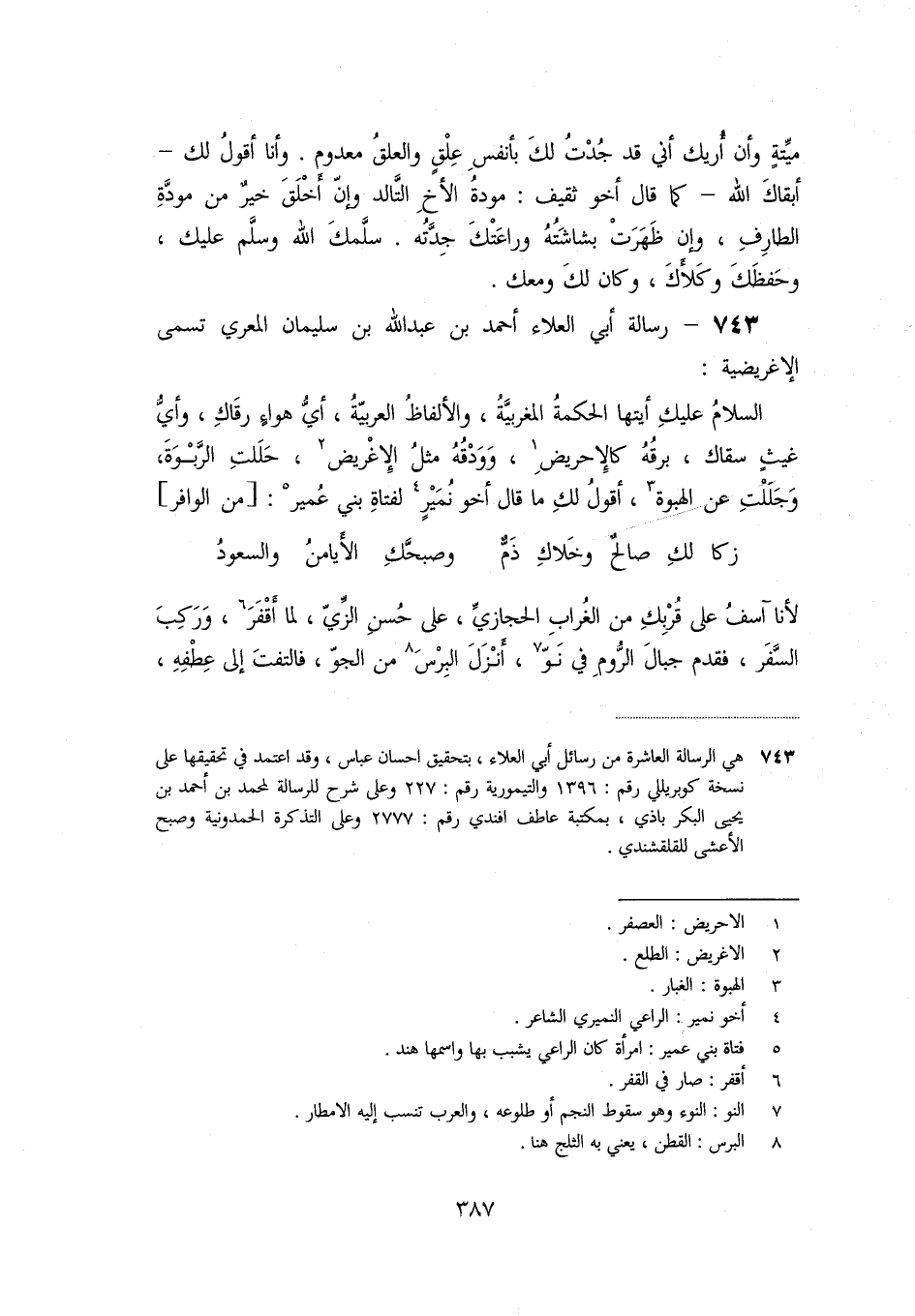 [743] هي الرسالة العاشرة من رسائل أبي العلاء، بتحقيق احسان عباس، وقد اعتمد في تحقيقها على نسخة كوبريللي رقم: 1396 والتيمورية رقم: 227 وعلى شرح للرسالة لمحمد بن أحمد بن يحيى البكر باذي، بمكتبة عاطف افندي رقم: 2777 وعلى التذكرة الحمدونية وصبح الأعشى للقلقشندي.