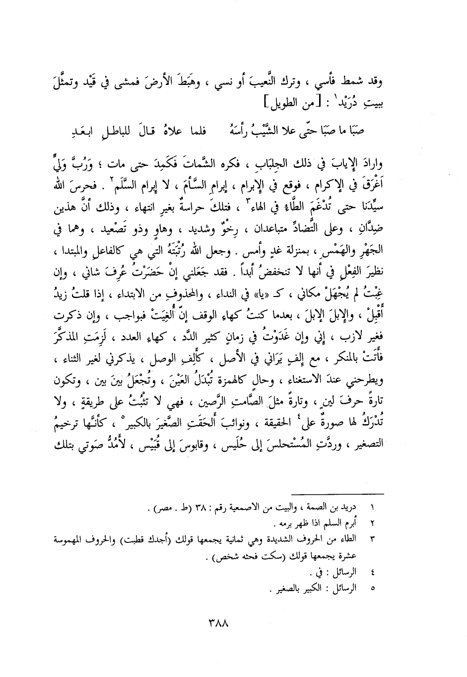 واراد الإياب في ذلك الجلباب، فكره الشّمات فكمد حتى مات؛ وربّ وليّ أغرق في الإكرام، فوقع في الإبرام، إبرام السّأم، لا إبرام السّلم «2» . فحرس الله سيّدنا حتى تدغم الطّاء في الهاء «3» ، فتلك حراسة بغير انتهاء، وذلك أنّ هذين ضدّان، وعلى التّضادّ متباعدان، رخو وشديد، وهاو وذو تصعيد، وهما في الجهر والهمس، بمنزلة غد وأمس. وجعل الله رتبته التي هي كالفاعل والمبتدا، نظير الفعل في أنها لا تنخفض أبدا. فقد جعلني إن حضرت عرف شاني، وإن غبت لم يجهل مكاني، ك «يا» في النداء، والمحذوف من الابتداء، إذا قلت زيد أقبل، والإبل الإبل، بعد ما كنت كهاء الوقف إنّ ألغيت فبواجب، وإن ذكرت فغير لازب، إني وإن غدوت في زمان كثير الدّد، كهاء العدد، لزمت المذكّر فأتت بالمنكر، مع إلف يراني في الأصل، كألف الوصل، يذكرني لغير الثناء، ويطرحني عند الاستغناء، وحال كالهمزة تبدل العين، وتجعل بين بين، وتكون تارة حرف لين، وتارة مثل الصّامت الرّصين، فهي لا تثبت على طريقة، ولا تدرك لها صورة على «4» الحقيقة، ونوائب ألحقت الصّغير بالكبير «5» ، كأنّها ترخيم التصغير، وردّت المستحلس إلى حليس، وقابوس إلى قبيس، لأمدّ صوتي بتلك