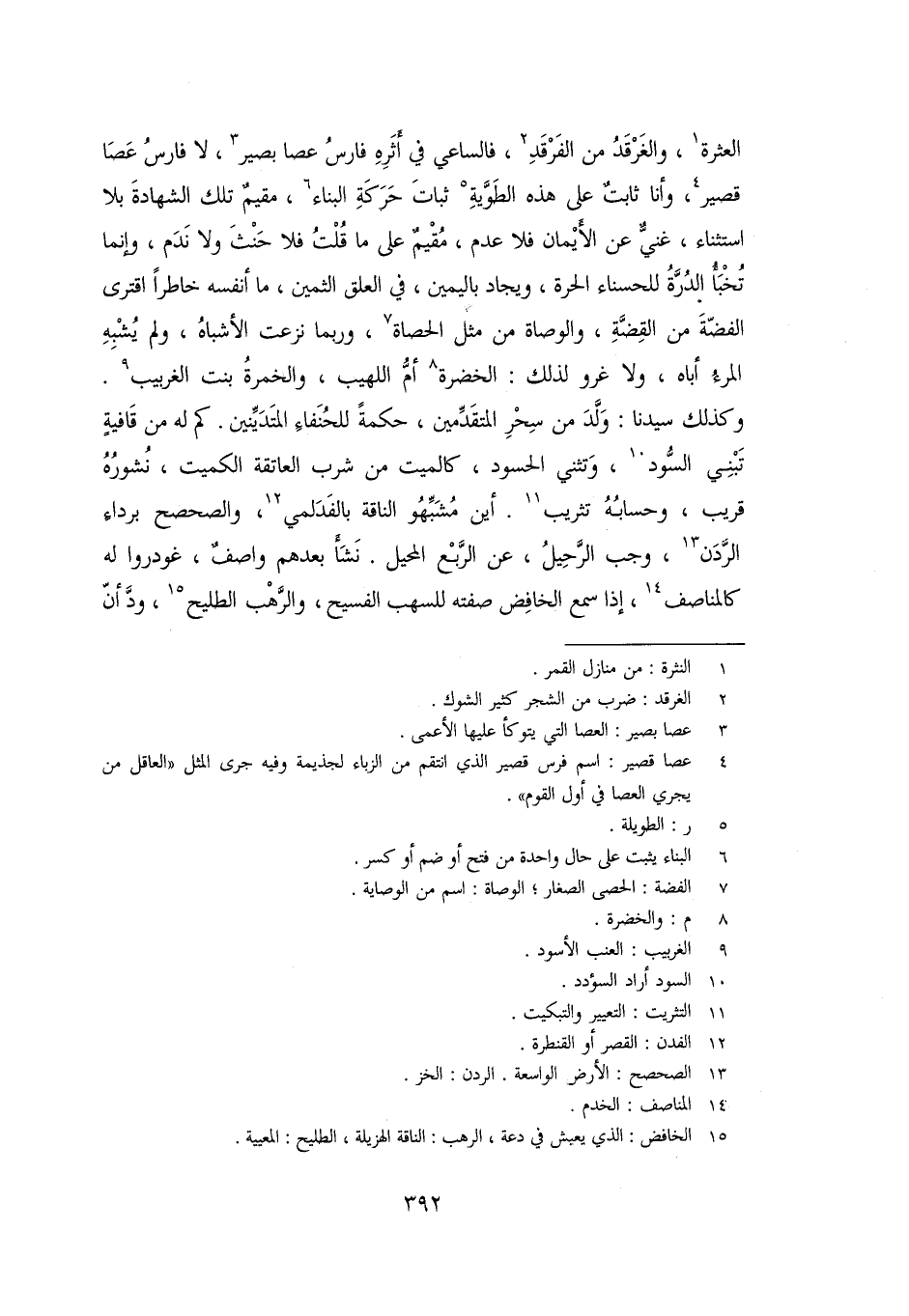 وكذلك سيدنا: ولّد من سحر المتقدّمين، حكمة للحنفاء المتديّنين. كم له من قافية تبني السّود «10» ، وتثني الحسود، كالميت من شرب العاتقة الكميت، نشوره قريب، وحسابه تثريب «11» . أين مشبّهو الناقة بالفدلمي «12» ، والصحصح برداء الرّدن «13» ، وجب الرّحيل، عن الرّبع المحيل. نشأ بعدهم واصف، غودروا له كالمناصف «14» ، إذا سمع الخافض صفته للسهب الفسيح، والرّهب الطليح، «15» ودّ أنّ
