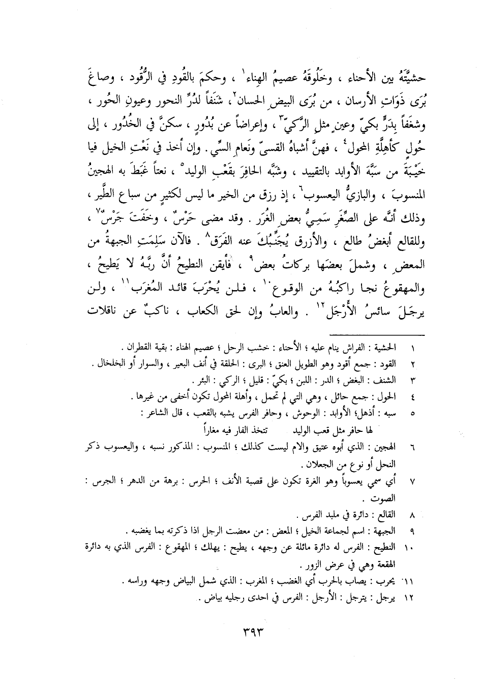 حشيّته بين الأحناء، وخلوقه عصيم الهناء «1» ، وحكم بالقود في الرّقود، وصاغ برى ذوات الأرسان، من برى البيض الحسان «2» ، شنفا لدرّ النحور وعيون الحور، وشغفا بدرّ بكيّ وعين مثل الرّكيّ «3» ، وإعراضا عن بدور، سكنّ في الخدور، إلى حول كأهلّة المحول «4» ، فهنّ أشباه القسىّ ونعام السّي. وإن أخذ في نعت الخيل فيا خيبة من سبّه الأوابد بالتقييد، وشبّه الحافر بقعب الوليد «5» ، نعتا غبط به الهجين المنسوب، والبازيّ اليعسوب «6» ، إذ رزق من الخير ما ليس لكثير من سباع الطّير، وذلك أنّه على الصّغر سميّ بعض الغرر. وقد مضى حرس، وخفت جرس «7» ، وللقالع أبغض طالع، والأزرق يجنّبك عنه الفرق «8» . فالآن سلمت الجبهة من المعض، وشمل بعضها بركات بعض «9» ، فأيقن النطيح أنّ ربّه لا يطيح، والمهقوع نجا راكبه من الوقوع «10» ، فلن يحرب قائد المغرب «11» ، ولن يرجل سائس الأرجل «12» . والعاب وإن لحق الكعاب، ناكب عن ناقلات