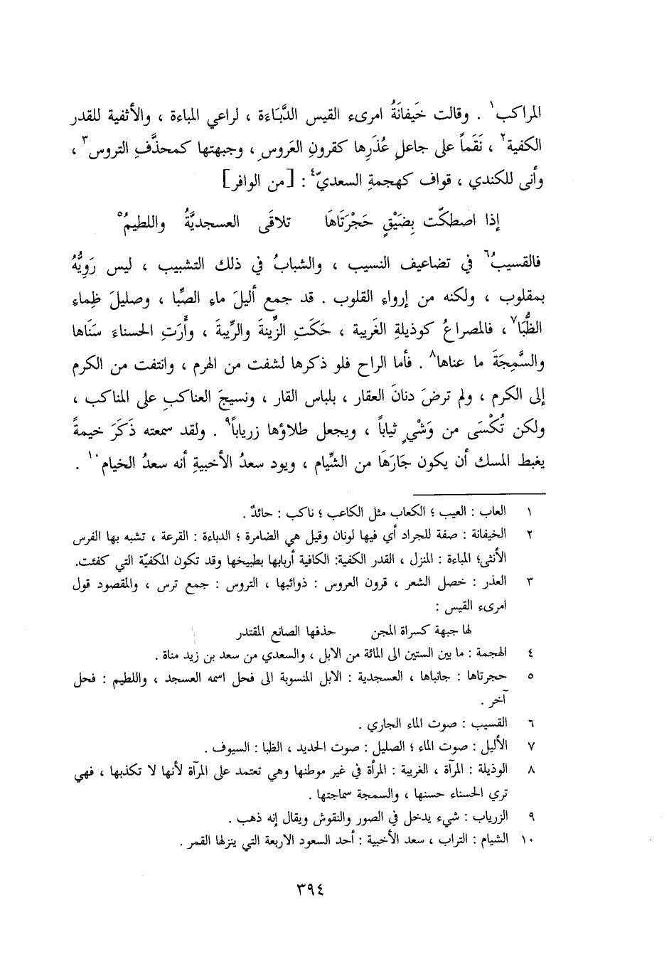 المراكب «1» . وقالت خيفانة امرىء القيس الدّباءة، لراعي المباءة، والأثفية للقدر الكفية «2» ، نقما على جاعل عذرها كقرون العروس، وجبهتها كمحذّف التروس «3» ، وأنى للكندي، قواف كهجمة السعديّ «4» : [من الوافر]