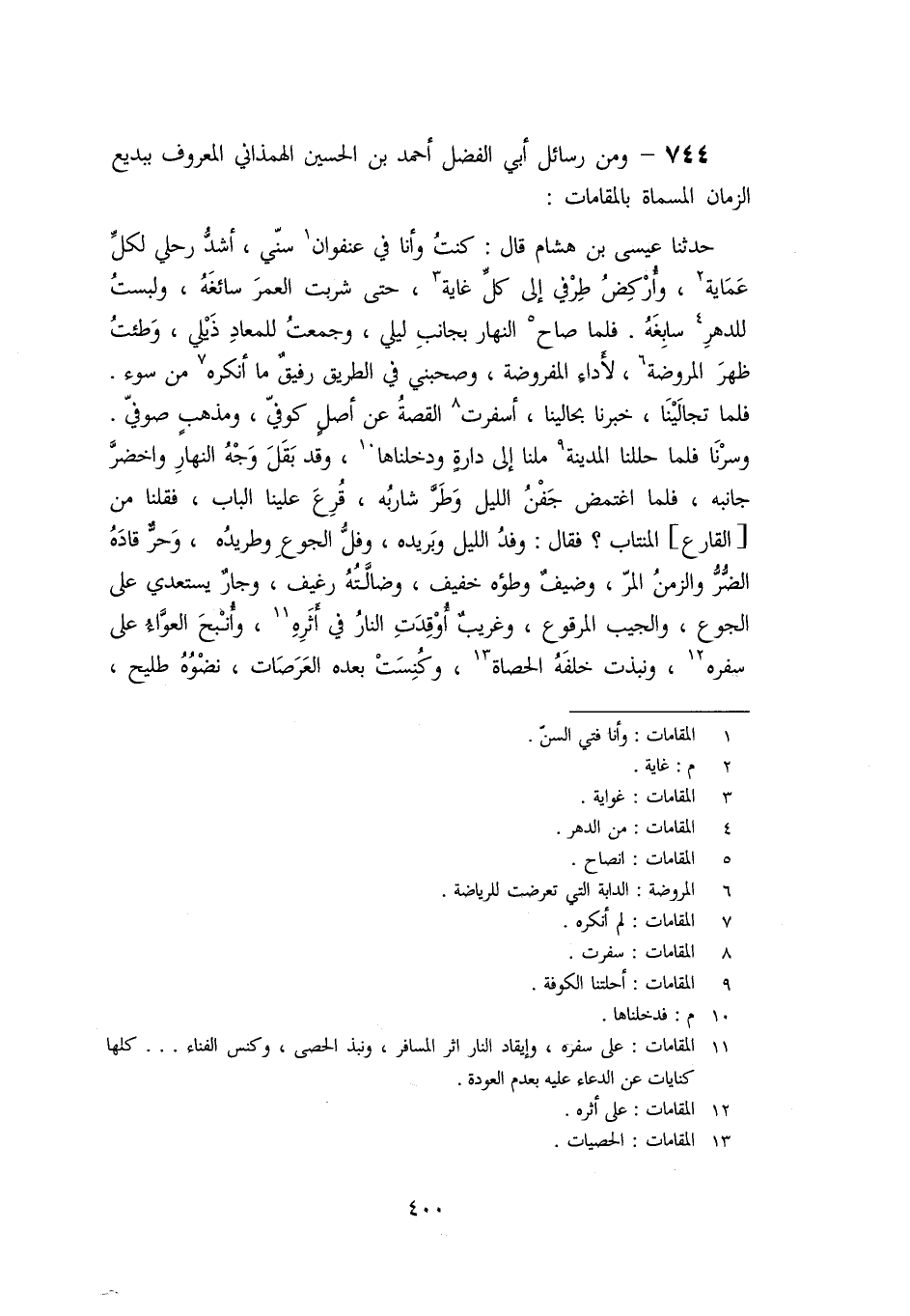 [744]- ومن رسائل أبي الفضل أحمد بن الحسين الهمذاني المعروف ببديع الزمان المسماة بالمقامات: