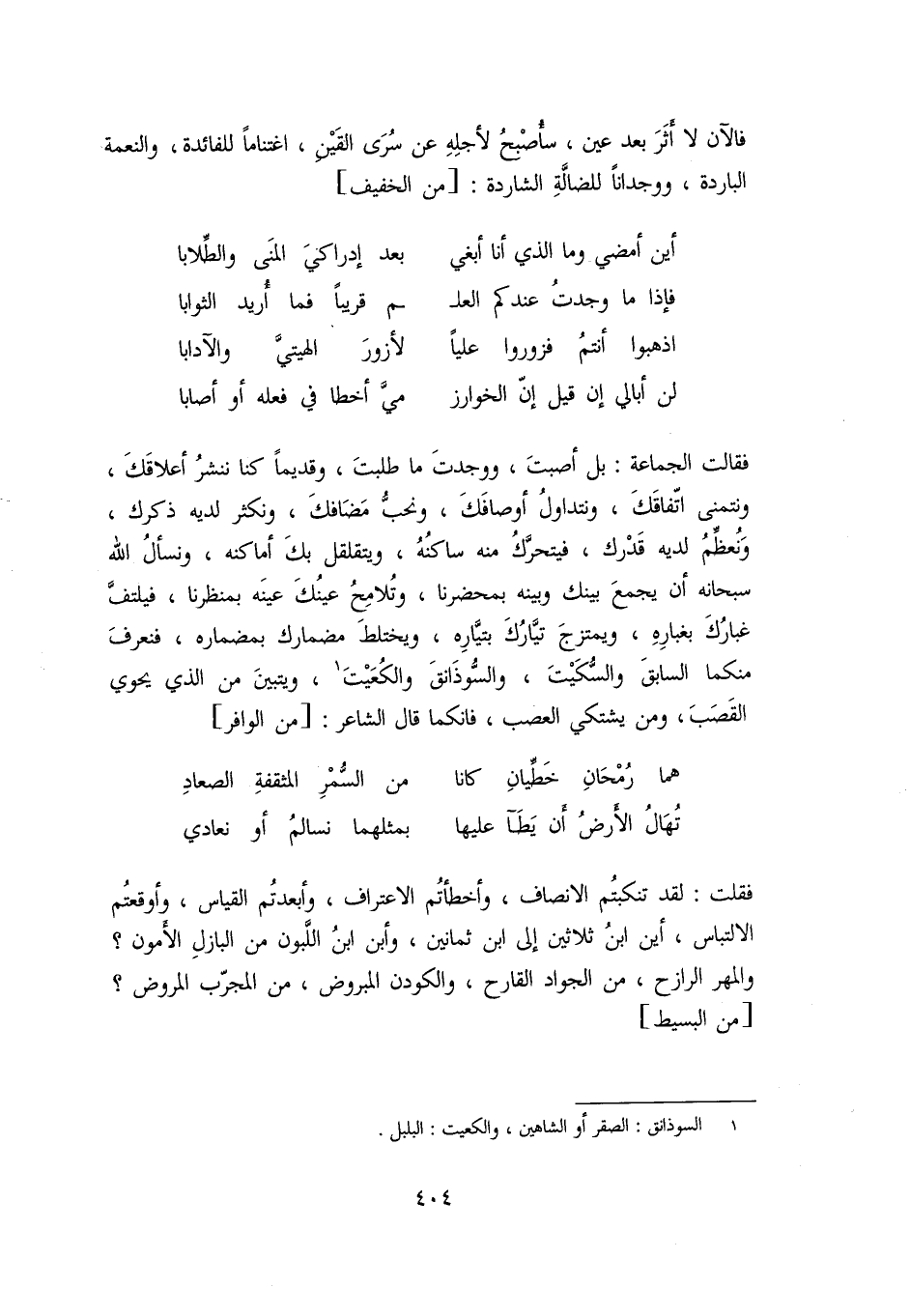 فقالت الجماعة: بل أصبت، ووجدت ما طلبت، وقديما كنا ننشر أعلاقك، ونتمنى اتّفاقك، ونتداول أوصافك، ونحبّ مضافك، ونكثر لديه ذكرك، ونعظّم لديه قدرك، فيتحرّك منه ساكنه، ويتقلقل بك أماكنه، ونسأل الله سبحانه أن يجمع بينك وبينه بمحضرنا، وتلامح عينك عينه بمنظرنا، فيلتفّ غبارك بغباره، ويمتزج تيّارك بتيّاره، ويختلط مضمارك بمضماره، فنعرف منكما السابق والسّكيت، والسّوذانق والكعيت «1» ، ويتبين من الذي يحوي القصب، ومن يشتكي العصب، فانكما قال الشاعر: [من الوافر]