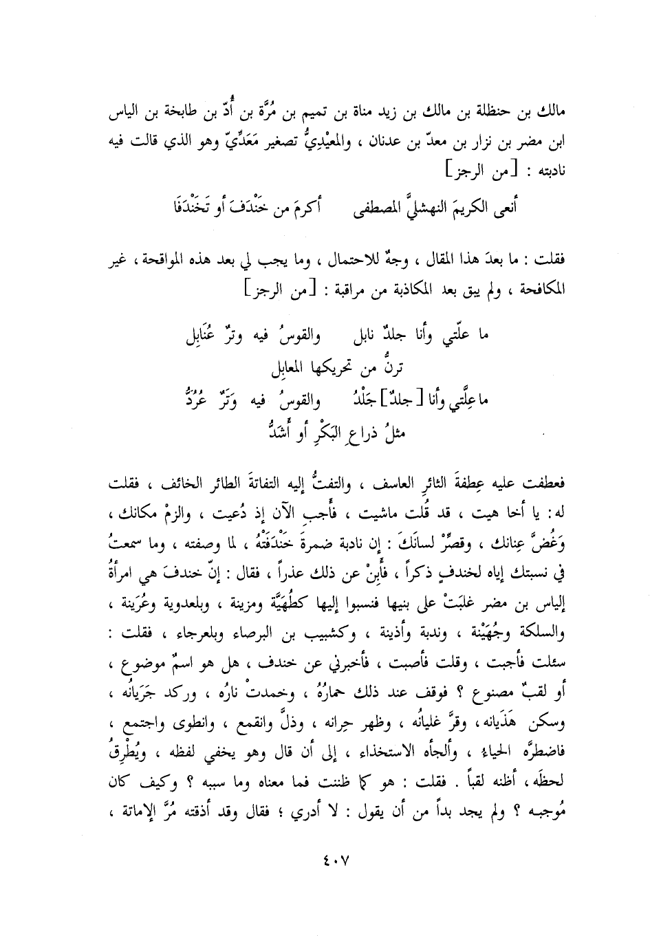 فعطفت عليه عطفة الثائر العاسف، والتفتّ إليه التفاتة الطائر الخائف، فقلت له: يا أخا هيت، قد قلت ماشيت، فأجب الآن إذ دعيت، والزم مكانك، وغضّ عنانك، وقصّر لسانك: إن نادبة ضمرة خندفته، لما وصفته، وما سمعت في نسبتك إياه لخندف ذكرا، فأبن عن ذلك عذرا، فقال: إنّ خندف هي امرأة إلياس بن مضر غلبت على بنيها فنسبوا إليها كطهيّة ومزينة، وبلعدوية وعرينة، والسلكة وجهينة، وندبة وأذينة، وكشبيب بن البرصاء وبلعرجاء، فقلت: