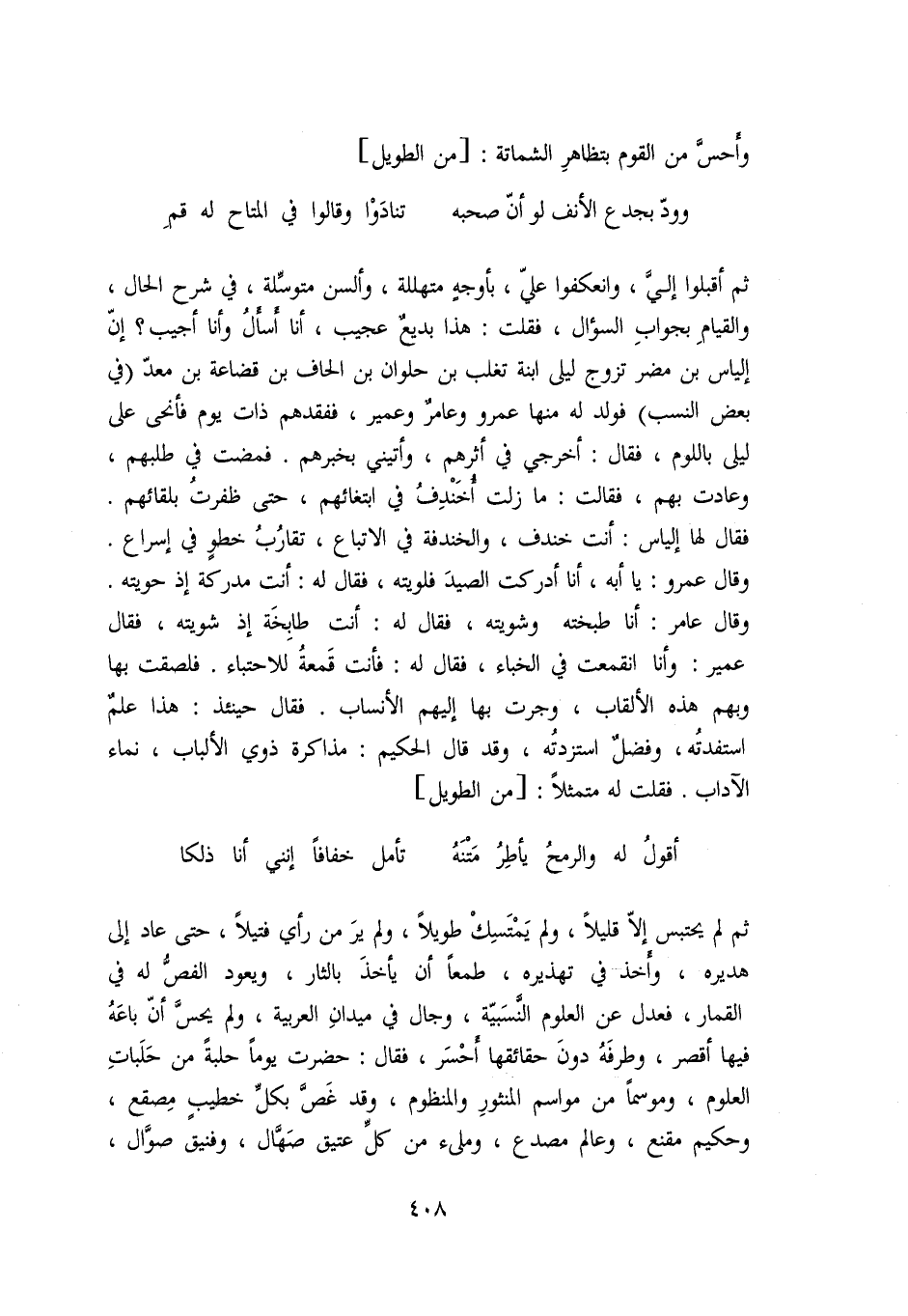 ثم لم يحتبس إلّا قليلا، ولم يمتسك طويلا، ولم ير من رأي فتيلا، حتى عاد إلى هديره، وأخذ في تهذيره، طمعا أن يأخذ بالثار، ويعود الفصّ له في القمار، فعدل عن العلوم النّسبيّة، وجال في ميدان العربية، ولم يحسّ أنّ باعه فيها أقصر، وطرفه دون حقائقها أحسر، فقال: حضرت يوما حلبة من حلبات العلوم، وموسما من مواسم المنثور والمنظوم، وقد غصّ بكلّ خطيب مصقع، وحكيم مقنع، وعالم مصدع، وملىء من كلّ عتيق صهّال، وفنيق صوّال،