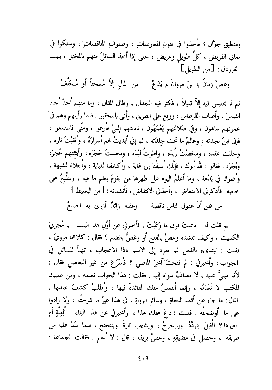 ومنطيق جوّال، فأخذوا في فنون المعارضات، وصنوف المناقضات، وسلكوا في معاني القريض، كلّ طويل وعريض، حتى إذا أخذ السائل منهم بالمخنق، ببيت الفرزدق: [من الطويل]