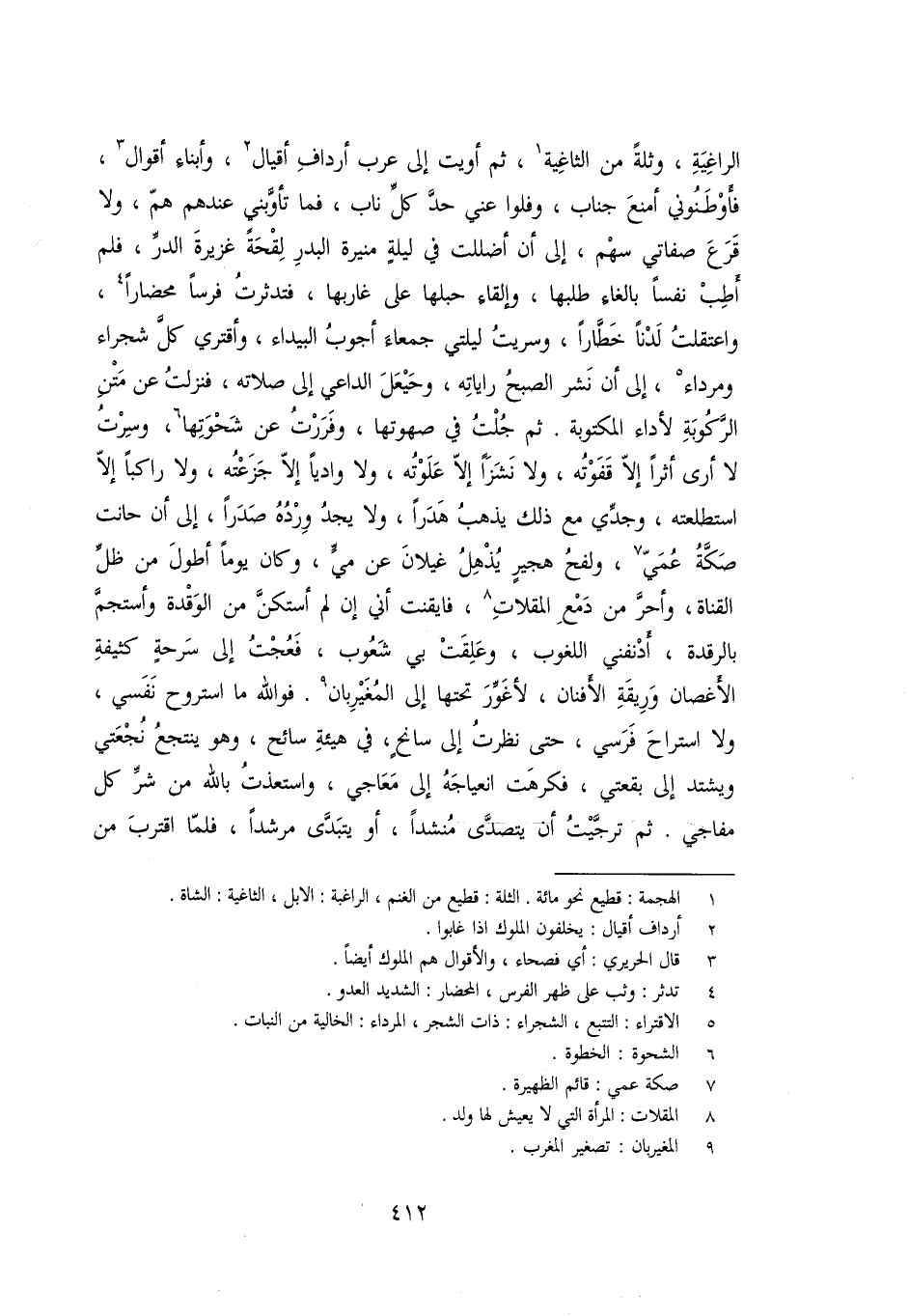 الراغية، وثلة من الثاغية «1» ، ثم أويت إلى عرب أرداف أقيال «2» ، وأبناء أقوال «3» ، فأوطنوني أمنع جناب، وفلوا عني حدّ كلّ ناب، فما تأوّبني عندهم همّ، ولا قرع صفاتي سهم، إلى أن أضللت في ليلة منيرة البدر لقحة غزيرة الدرّ، فلم أطب نفسا بالغاء طلبها، وإلقاء حبلها على غاربها، فتدثرت فرسا محضارا «4» ، واعتقلت لدنا خطّارا، وسريت ليلتي جمعاء أجوب البيداء، وأقتري كلّ شجراء ومرداء «5» ، إلى أن نشر الصبح راياته، وحيعل الداعي إلى صلاته، فنزلت عن متن الرّكوبة لأداء المكتوبة. ثم جلت في صهوتها، وفررت عن شحوتها «6» ، وسرت لا أرى أثرا إلّا قفوته، ولا نشزا إلّا علوته، ولا واديا إلّا جزعته، ولا راكبا إلّا استطلعته، وجدّي مع ذلك يذهب هدرا، ولا يجد ورده صدرا، إلى أن حانت صكّة عميّ «7» ، ولفح هجير يذهل غيلان عن ميّ، وكان يوما أطول من ظلّ القناة، وأحرّ من دمع المقلات «8» ، فايقنت أني إن لم أستكنّ من الوقدة وأستجمّ بالرقدة، أدنفني اللغوب، وعلقت بي شعوب، فعجت إلى سرحة كثيفة الأغصان وريقة الأفنان، لأغوّر تحتها إلى المغيربان «9» . فو الله ما استروح نفسي، ولا استراح فرسي، حتى نظرت إلى سانح، في هيئة سائح، وهو ينتجع نجعتي ويشتد إلى بقعتي، فكرهت انعياجه إلى معاجي، واستعذت بالله من شرّ كل مفاجي. ثم ترجّيت أن يتصدّى منشدا، أو يتبدّى مرشدا، فلمّا اقترب من