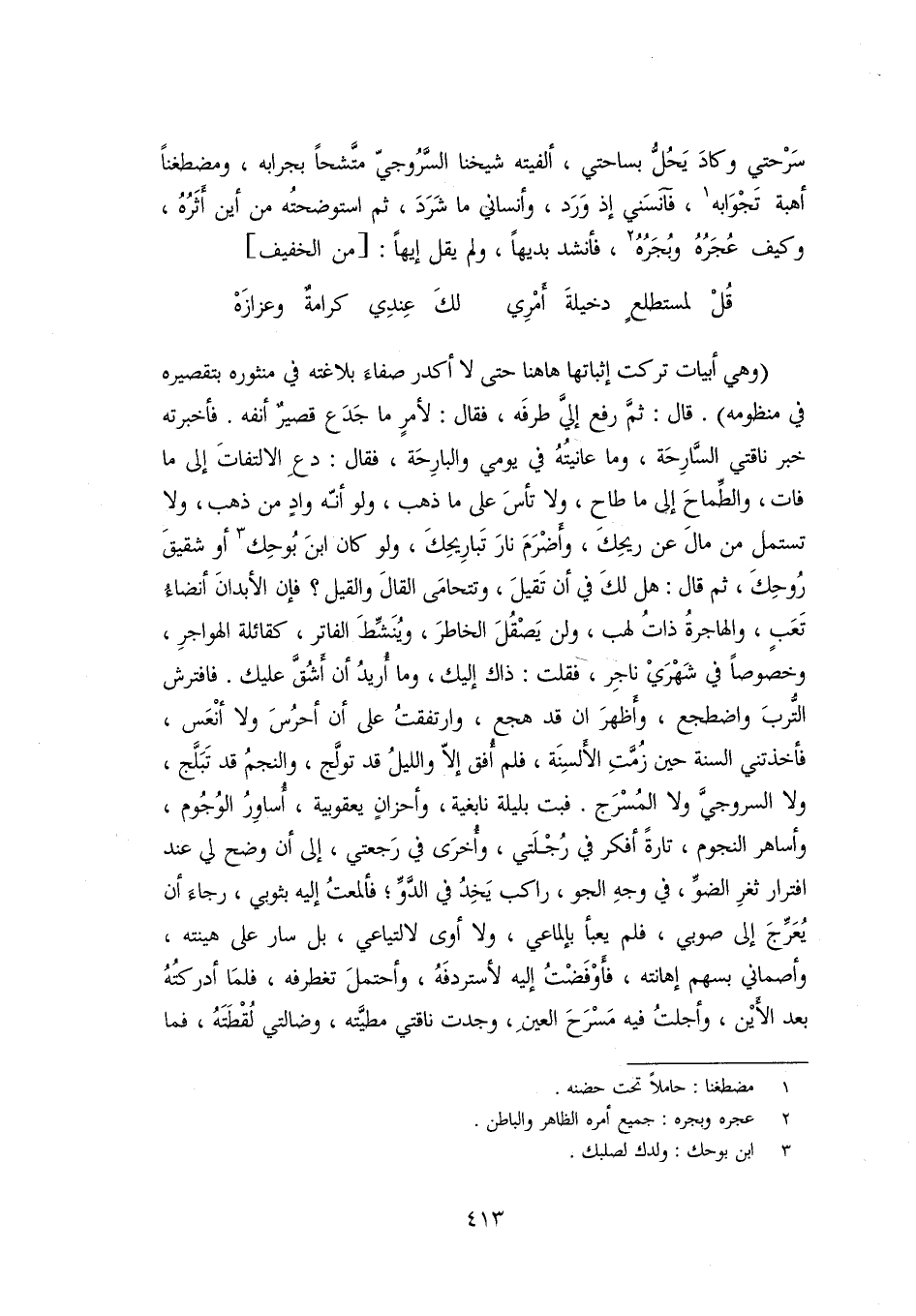 (وهي أبيات تركت إثباتها هاهنا حتى لا أكدر صفاء بلاغته في منثوره بتقصيره في منظومه) . قال: ثمّ رفع إليّ طرفه، فقال: لأمر ما جدع قصير أنفه. فأخبرته خبر ناقتي السّارحة، وما عانيته في يومي والبارحة، فقال: دع الالتفات إلى ما فات، والطّماح إلى ما طاح، ولا تأس على ما ذهب، ولو أنّه واد من ذهب، ولا تستمل من مال عن ريحك، وأضرم نار تباريحك، ولو كان ابن بوحك «3» أو شقيق روحك، ثم قال: هل لك في أن تقيل، وتتحامى القال والقيل؟ فإن الأبدان أنضاء تعب، والهاجرة ذات لهب، ولن يصقل الخاطر، وينشّط الفاتر، كقائلة الهواجر، وخصوصا في شهري ناجر، فقلت: ذاك إليك، وما أريد أن أشقّ عليك. فافترش التّرب واضطجع، وأظهر ان قد هجع، وارتفقت على أن أحرس ولا أنعس، فأخذتني السنة حين زمّت الألسنة، فلم أفق إلّا والليل قد تولّج، والنجم قد تبلّج، ولا السروجيّ ولا المسرج. فبت بليلة نابغية، وأحزان يعقوبية، أساور الوجوم، وأساهر النجوم، تارة أفكر في رجلتي، وأخرى في رجعتي، إلى أن وضح لي عند افترار ثغر الضوّ، في وجه الجو، راكب يخد في الدّوّ؛ فألمعت إليه بثوبي، رجاء أن يعرّج إلى صوبي، فلم يعبأ بإلماعي، ولا أوى لالتياعي، بل سار على هينته، وأصماني بسهم إهانته، فأوفضت إليه لأستردفه، وأحتمل تغطرفه، فلما أدركته بعد الأين، وأجلت فيه مسرح العين، وجدت ناقتي مطيّته، وضالتي لقطته، فما