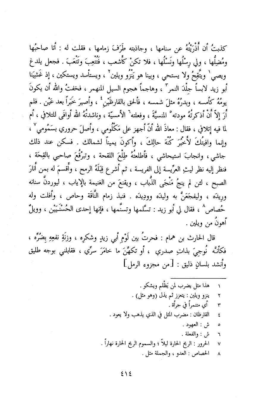 كذبت أن أذريته عن سنامها، وجاذبته طرف زمامها، فقلت له: أنا صاحبها ومضلّها، ولي رسلها ونسلها، فلا تكن كأشعب، فتتعب وتتعب. فجعل يلدغ ويصي «1» ويتّقح ولا يستحي، وبينا هو ينزو ويلين «2» ، ويستأسد ويستكين، إذ غشينا أبو زيد لابسا جلد النمر «3» ، وهاجما هجوم السيل المنهمر، فخفت والله أن يكون يومه كأمسه، وبدره مثل شمسه، فألحق بالقارظين «4» ، وأصير خبرا بعد عين. فلم أر إلّا أن أذكرته مودته «5» المنسيّة، وفعلته «6» الأمسيّة، وناشدته الله أوافى للتلافي، أم لما فيه إتلافي، فقال: معاذ الله أنّ أجهز على مكلومي، وأصل حروري بسمومي «7» ، وإنما وافيتك لأخبر كنه حالك، وأكون يمينا لشمالك. فسكن عند ذلك جاشي، وانجاب استيحاشي، فأطلعته طلع اللقحة، وتبرقع صاحبي بالقحة، فنظر إليه نظر ليث العرّيسة إلى الفريسة، ثم أشرع قبله الرمح، وأقسم له بمن أنار الصبح، لئن لم ينج منجى الذّباب، ويقنع من الغنيمة بالإياب، ليوردنّ سنانه وريده، وليفجعنّ به وليده ووديده. فنبذ زمام النّاقة وحاص، وأفلت وله حصاص «8» ، فقال لي أبو زيد: تسّلمها وتسنّمها، فإنها إحدى الحسنيين، وويل أهون من ويلين.