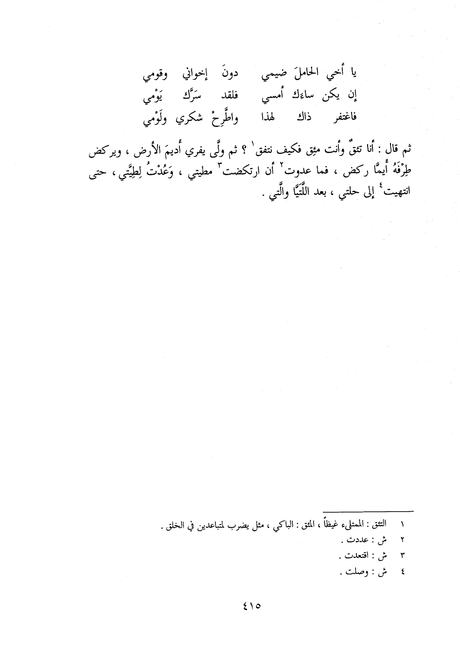 ثم قال: أنا تئق وأنت مئق فكيف نتفق «1» ؟ ثم ولّى يفري أديم الأرض، ويركض طرفه أيمّا ركض، فما عدوت «2» أن ارتكضت «3» مطيتي، وعدت لطيّتي، حتى انتهيت «4» إلى حلتي، بعد اللّتيّا والّتي.