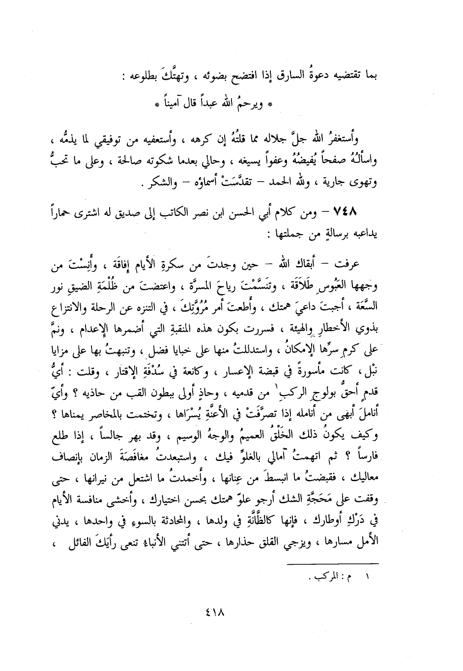 748- ومن كلام أبي الحسن ابن نصر الكاتب إلى صديق له اشترى حمارا يداعبه برسالة من جملتها: