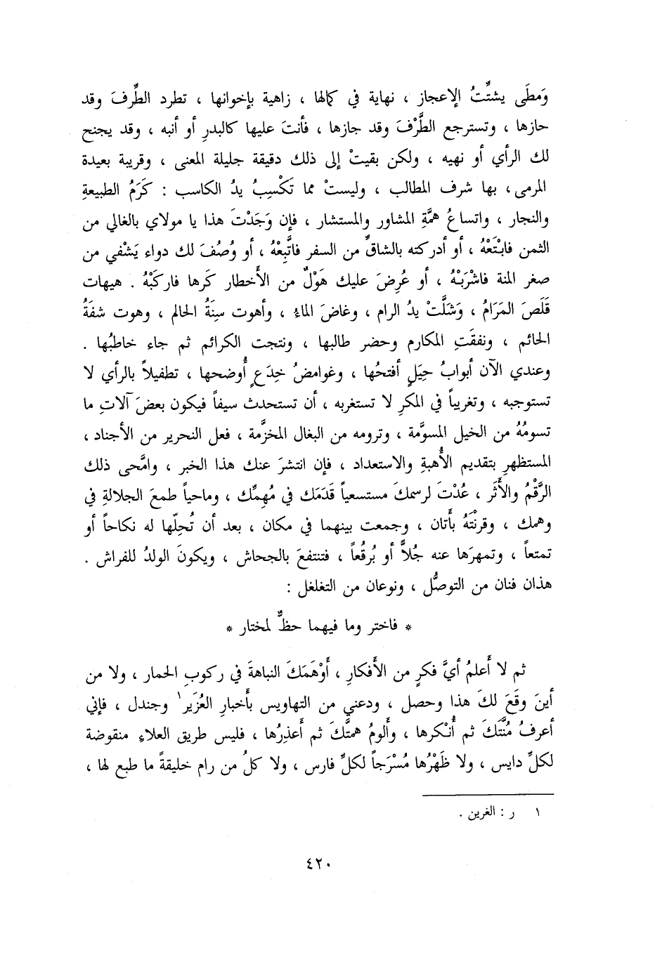 ثم لا أعلم أيّ فكر من الأفكار، أوهمك النباهة في ركوب الحمار، ولا من أين وقع لك هذا وحصل، ودعني من التهاويس بأخبار العزير «1» وجندل، فإني أعرف منّتك ثم أنكرها، وألوم همتّك ثم أعذرها، فليس طريق العلاء منقوضة لكلّ دايس، ولا ظهرها مسرجا لكلّ فارس، ولا كل من رام خليقة ما طبع لها،