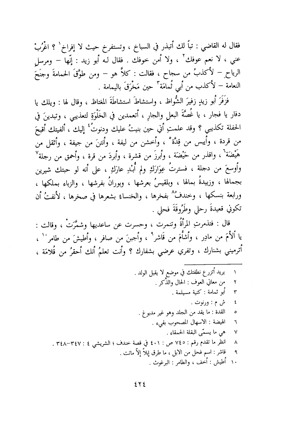 فقال له القاضي: تبا لك أتبذر في السباخ، وتستفرخ حيث لا إفراخ «1» ؟ اغرب عني، لا نعم عوفك «2» ، ولا أمن خوفك. فقال له أبو زيد: إنّها- ومرسل الرياح- لأكذب من سجاح، فقالت: كلّا هو- ومن طوّق الحمامة وجنح النعامة- لأكذب من أبي ثمامة «3» حين مخرق باليمامة.