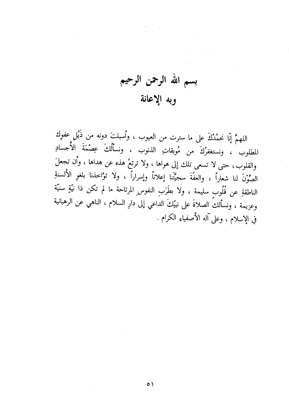 بسم الله الرحمن الرحيم وبه الإعانة اللهمّ إنّا نحمدك على ما سترت من العيوب، وأسبلت دونه من ذيل عفوك المطلوب، ونستغفرك من موبقات الذنوب، ونسألك عصمة الأجساد والقلوب، حتى لا تسعى تلك إلى هواها، ولا ترتع هذه عن هداها، وأن تجعل الصّون لنا شعارا، والعفّة سجيّتنا إعلانا وإسرارا، ولا تؤاخذنا بلغو الألسنة الناطقة عن قلوب سليمة، ولا بطرب النفوس المرتاحة ما لم تكن ذا نيّة سنيّة وعزيمة، ونسألك الصلاة على نبيّك الداعي إلى دار السلام، الناهي عن الرهبانية في الإسلام، وعلى آله الأصفياء الكرام.