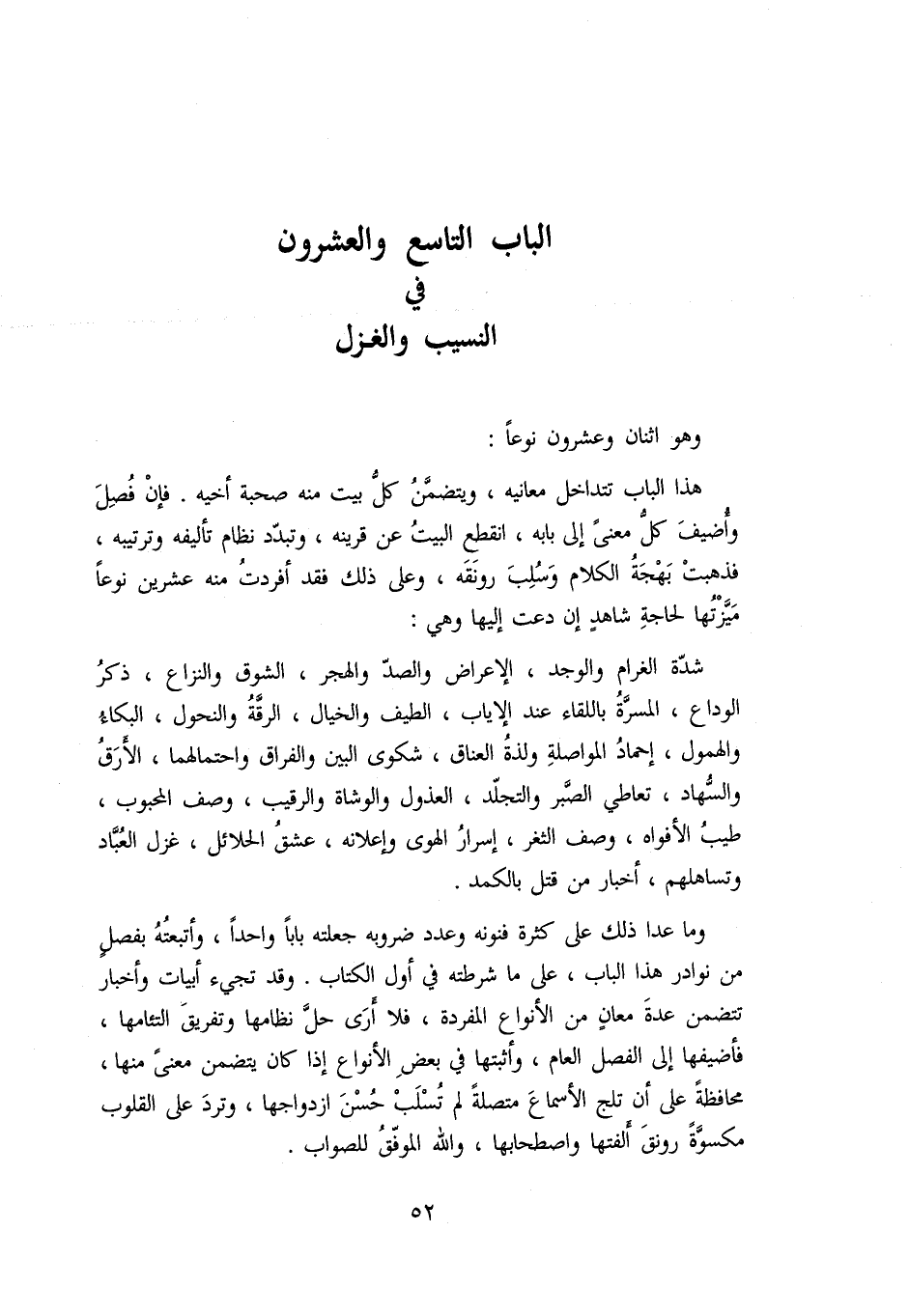 هذا الباب تتداخل معانيه، ويتضمّن كلّ بيت منه صحبة أخيه. فإن فصل وأضيف كلّ معنى إلى بابه، انقطع البيت عن قرينه، وتبدّد نظام تأليفه وترتيبه، فذهبت بهجة الكلام وسلب رونقه، وعلى ذلك فقد أفردت منه عشرين نوعا ميّزتها لحاجة شاهد إن دعت إليها وهي: