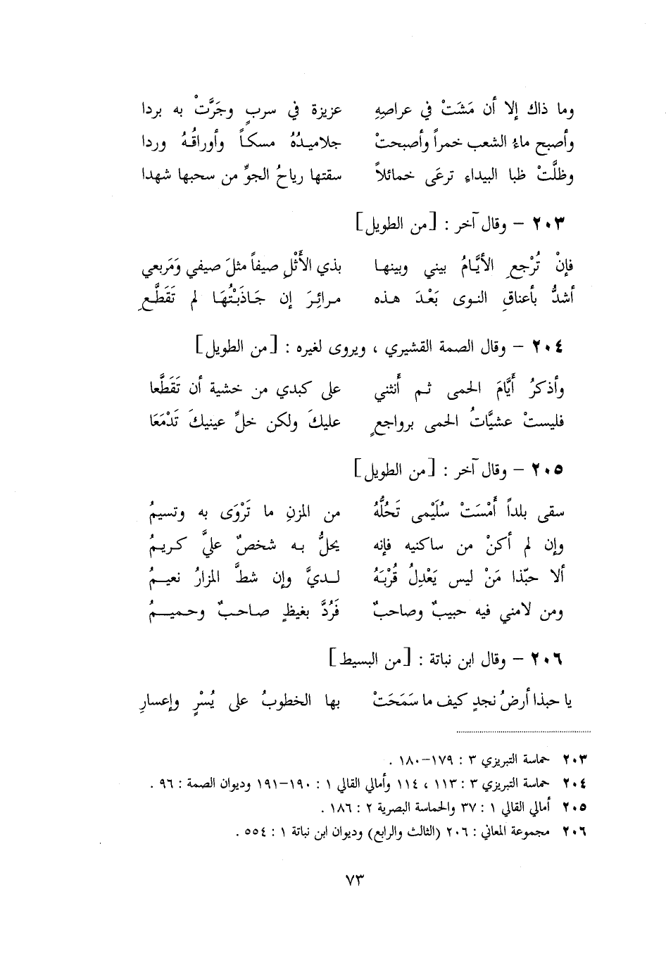 [204] حماسة التبريزي 3: 113، 114 وأمالي القالي 1: 190- 191 وديوان الصمة: 96.